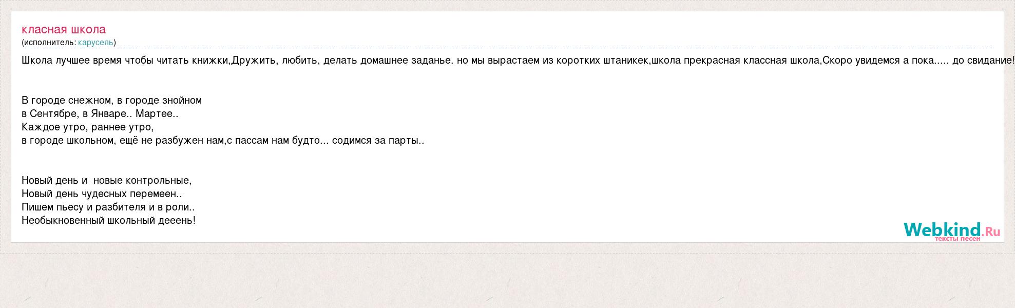 Школа лучшее время чтобы читать книжки,Дружить, любить, делать домашнее заданье. но мы вырастаем из коротких штаникек,школа прекрасная классная школа,Скоро увидемся а пока..... до свидание! В городе снежном, в городе знойном в Сентябре, в Январе.. Мартее.. Каждое утро, раннее утро, в городе школьном, ещё не разбужен нам,с пассам нам будто... содимся за парты.. Новый день и новые контрольные, Новый день чудесных перемеен.. Пишем пьесу и разбителя и в роли.. Необыкновенный школьный дееень!
