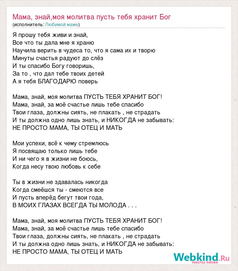 Я прошу тебя живи и знай, Все что ты дала мне я храню Научила верить в чудеса то, что я сама их и творю Минуты счастья радуют до слёз И ты спасибо Богу говоришь, За то , что дал тебе твоих детей А я тебя БЛАГОДАРЮ поверь Мама, знай, моя молитва ПУСТЬ ТЕБЯ ХРАНИТ БОГ! Мама, знай, за моё счастье лишь тебе спасибо Твои глаза, должны сиять, не плакать , не страдать И ты должна одно лишь знать, и НИКОГДА не забывать: НЕ ПРОСТО МАМА, ТЫ ОТЕЦ И МАТЬ Мои успехи, всё к чему стремлюсь Я посвящаю только лишь тебе И ни чего я в жизни не боюсь, Когда несу твою любовь к себе Ты в жизни не здавалась никогда Когда смеёшся ты - смеются все И пусть вперёд бегут твои года, В МОИХ ГЛАЗАХ ВСЕГДА ТЫ МОЛОДА . . . Мама, знай, моя молитва ПУСТЬ ТЕБЯ ХРАНИТ БОГ! Мама, знай, за моё счастье лишь тебе спасибо Твои глаза, должны сиять, не плакать , не страдать И ты должна одно лишь знать, и НИКОГДА не забывать: НЕ ПРОСТО МАМА, ТЫ ОТЕЦ И МАТЬ