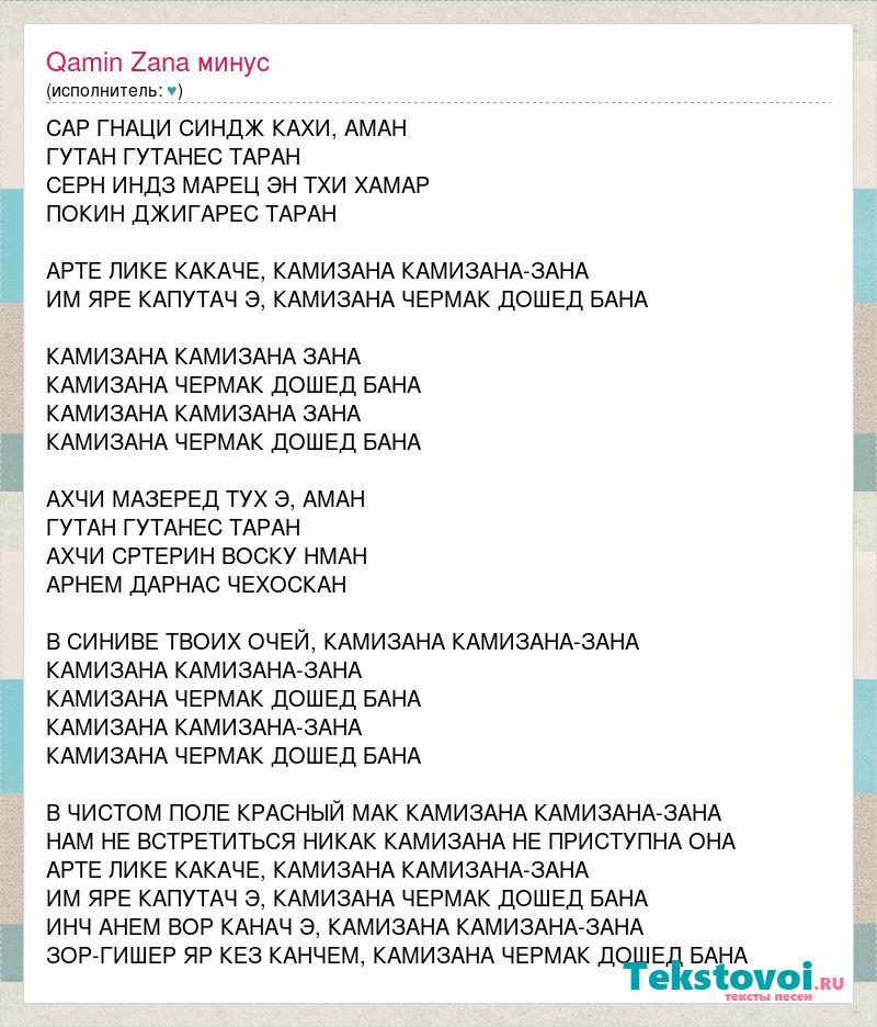 САР ГНАЦИ СИНДЖ КАХИ, АМАН ГУТАН ГУТАНЕС ТАРАН СЕРН ИНДЗ МАРЕЦ ЭН ТХИ ХАМАР ПОКИН ДЖИГАРЕС ТАРАН АРТЕ ЛИКЕ КАКАЧЕ, КАМИЗАНА КАМИЗАНА-ЗАНА ИМ ЯРЕ КАПУТАЧ Э, КАМИЗАНА ЧЕРМАК ДОШЕД БАНА КАМИЗАНА КАМИЗАНА ЗАНА КАМИЗАНА ЧЕРМАК ДОШЕД БАНА КАМИЗАНА КАМИЗАНА ЗАНА КАМИЗАНА ЧЕРМАК ДОШЕД БАНА АХЧИ МАЗЕРЕД ТУХ Э, АМАН ГУТАН ГУТАНЕС ТАРАН АХЧИ СРТЕРИН ВОСКУ НМАН АРНЕМ ДАРНАС ЧЕХОСКАН В СИНИВЕ ТВОИХ ОЧЕЙ, КАМИЗАНА КАМИЗАНА-ЗАНА КАМИЗАНА КАМИЗАНА-ЗАНА КАМИЗАНА ЧЕРМАК ДОШЕД БАНА КАМИЗАНА КАМИЗАНА-ЗАНА КАМИЗАНА ЧЕРМАК ДОШЕД БАНА В ЧИСТОМ ПОЛЕ КРАСНЫЙ МАК КАМИЗАНА КАМИЗАНА-ЗАНА НАМ НЕ ВСТРЕТИТЬСЯ НИКАК КАМИЗАНА НЕ ПРИСТУПНА ОНА АРТЕ ЛИКЕ КАКАЧЕ, КАМИЗАНА КАМИЗАНА-ЗАНА ИМ ЯРЕ КАПУТАЧ Э, КАМИЗАНА ЧЕРМАК ДОШЕД БАНА ИНЧ АНЕМ ВОР КАНАЧ Э, КАМИЗАНА КАМИЗАНА-ЗАНА ЗОР-ГИШЕР ЯР КЕЗ КАНЧЕМ, КАМИЗАНА ЧЕРМАК ДОШЕД БАНА