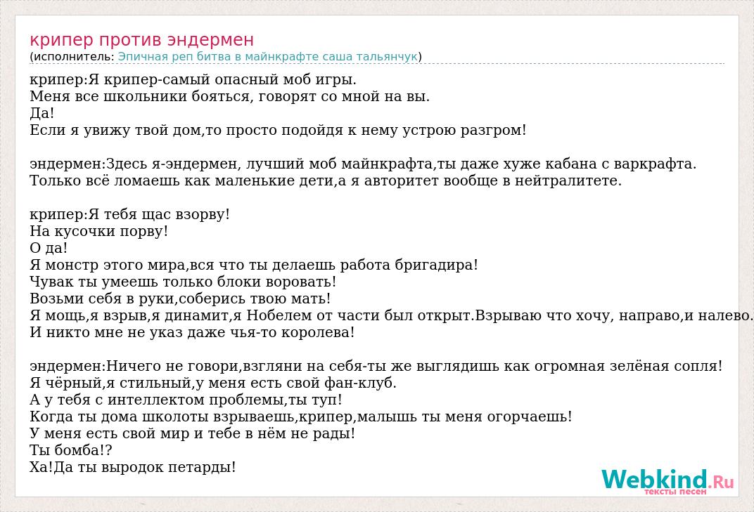 крипер:Я крипер-самый опасный моб игры. Меня все школьники бояться, говорят со мной на вы. Да! Если я увижу твой дом,то просто подойдя к нему устрою разгром! эндермен:Здесь я-эндермен, лучший моб майнкрафта,ты даже хуже кабана с варкрафта. Только всё ломаешь как маленькие дети,а я авторитет вообще в нейтралитете. крипер:Я тебя щас взорву! На кусочки порву! О да! Я монстр этого мира,вся что ты делаешь работа бригадира! Чувак ты умеешь только блоки воровать! Возьми себя в руки,соберись твою мать! Я мощь,я взрыв,я динамит,я Нобелем от части был открыт.Взрываю что хочу, направо,и налево. И никто мне не указ даже чья-то королева! эндермен:Ничего не говори,взгляни на себя-ты же выглядишь как огромная зелёная сопля! Я чёрный,я стильный,у меня есть свой фан-клуб. А у тебя с интеллектом проблемы,ты туп! Когда ты дома школоты взрываешь,крипер,малышь ты меня огорчаешь! У меня есть свой мир и тебе в нём не рады! Ты бомба!? Ха!Да ты выродок петарды!