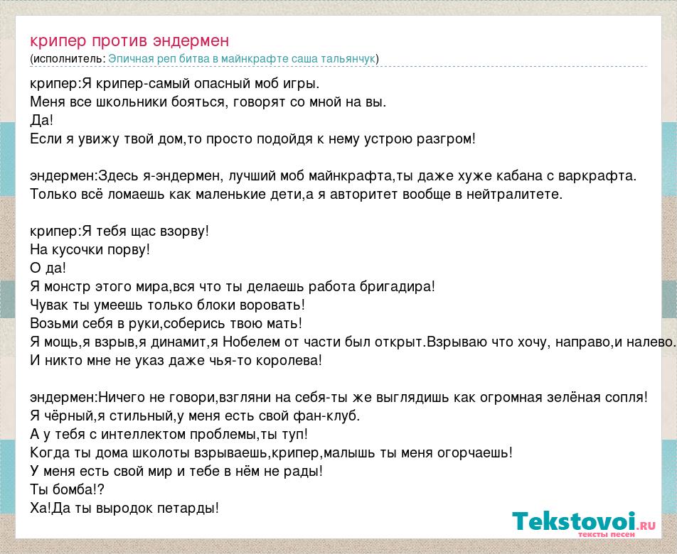 крипер:Я крипер-самый опасный моб игры. Меня все школьники бояться, говорят со мной на вы. Да! Если я увижу твой дом,то просто подойдя к нему устрою разгром! эндермен:Здесь я-эндермен, лучший моб майнкрафта,ты даже хуже кабана с варкрафта. Только всё ломаешь как маленькие дети,а я авторитет вообще в нейтралитете. крипер:Я тебя щас взорву! На кусочки порву! О да! Я монстр этого мира,вся что ты делаешь работа бригадира! Чувак ты умеешь только блоки воровать! Возьми себя в руки,соберись твою мать! Я мощь,я взрыв,я динамит,я Нобелем от части был открыт.Взрываю что хочу, направо,и налево. И никто мне не указ даже чья-то королева! эндермен:Ничего не говори,взгляни на себя-ты же выглядишь как огромная зелёная сопля! Я чёрный,я стильный,у меня есть свой фан-клуб. А у тебя с интеллектом проблемы,ты туп! Когда ты дома школоты взрываешь,крипер,малышь ты меня огорчаешь! У меня есть свой мир и тебе в нём не рады! Ты бомба!? Ха!Да ты выродок петарды!