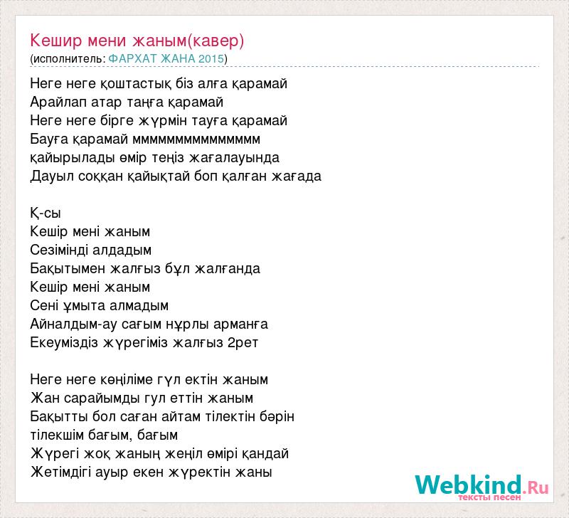 Неге неге қоштастық біз алға қарамай Арайлап атар таңға қарамай Неге неге бірге жүрмін тауға қарамай Бауға қарамай ммммммммммммммм қайырылады өмір теңіз жағалауында Дауыл соққан қайықтай боп қалған жағада Қ-сы Кешір мені жаным Сезімінді алдадым Бақытымен жалғыз бұл жалғанда Кешір мені жаным Сені ұмыта алмадым Айналдым-ау сағым нұрлы арманға Екеуміздіз жүрегіміз жалғыз 2рет Неге неге көңіліме гүл ектін жаным Жан сарайымды гул еттін жаным Бақытты бол саған айтам тілектін бәрін тілекшім бағым, бағым Жүрегі жоқ жаның жеңіл өмірі қандай Жетімдігі ауыр екен жүректін жаны