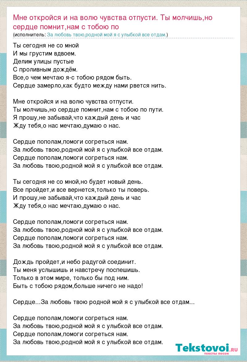 Главная→Исполнители→За любовь твою,родной мой я с улыбкой все отдам.→Мне откройся и на волю чувства отпусти. Ты молчишь,но сердце помнит,нам