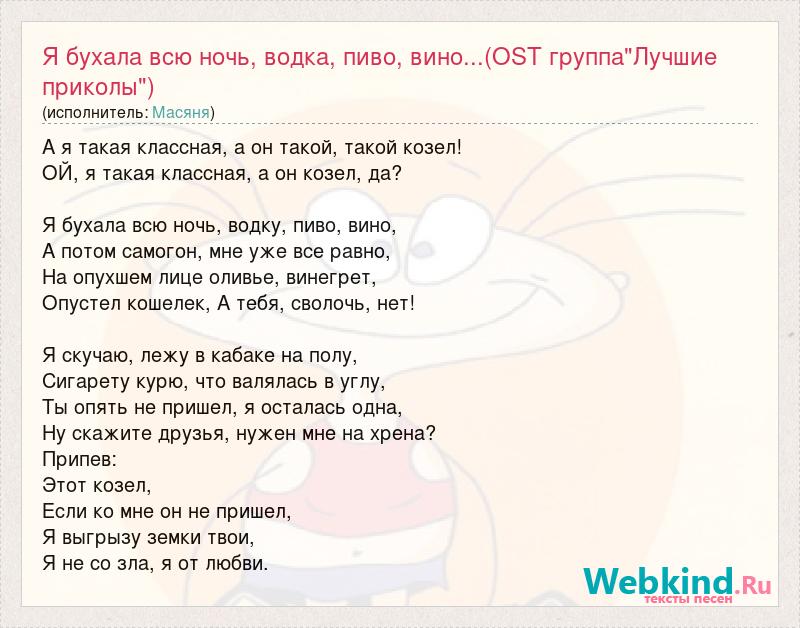 А я такая классная, а он такой, такой козел! ОЙ, я такая классная, а он козел, да? Я бухала всю ночь, водку, пиво, вино, А потом самогон, мне уже все равно, На опухшем лице оливье, винегрет, Опустел кошелек, А тебя, сволочь, нет! Я скучаю, лежу в кабаке на полу, Сигарету курю, что валялась в углу, Ты опять не пришел, я осталась одна, Ну скажите друзья, нужен мне на хрена? Припев: Этот козел, Если ко мне он не пришел, Я выгрызу земки твои, Я не со зла, я от любви.