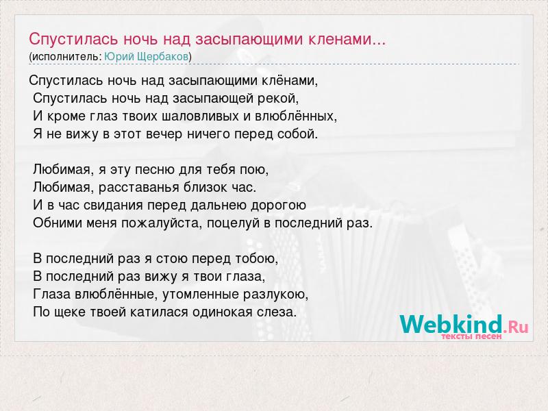 Спустилась ночь над засыпающими клёнами, Спустилась ночь над засыпающей рекой, И кроме глаз твоих шаловливых и влюблённых, Я не вижу в этот вечер ничего перед собой. Любимая, я эту песню для тебя пою, Любимая, расставанья близок час. И в час свидания перед дальнею дорогою Обними меня пожалуйста, поцелуй в последний раз. В последний раз я стою перед тобою, В последний раз вижу я твои глаза, Глаза влюблённые, утомленные разлукою, По щеке твоей катилася одинокая слеза.