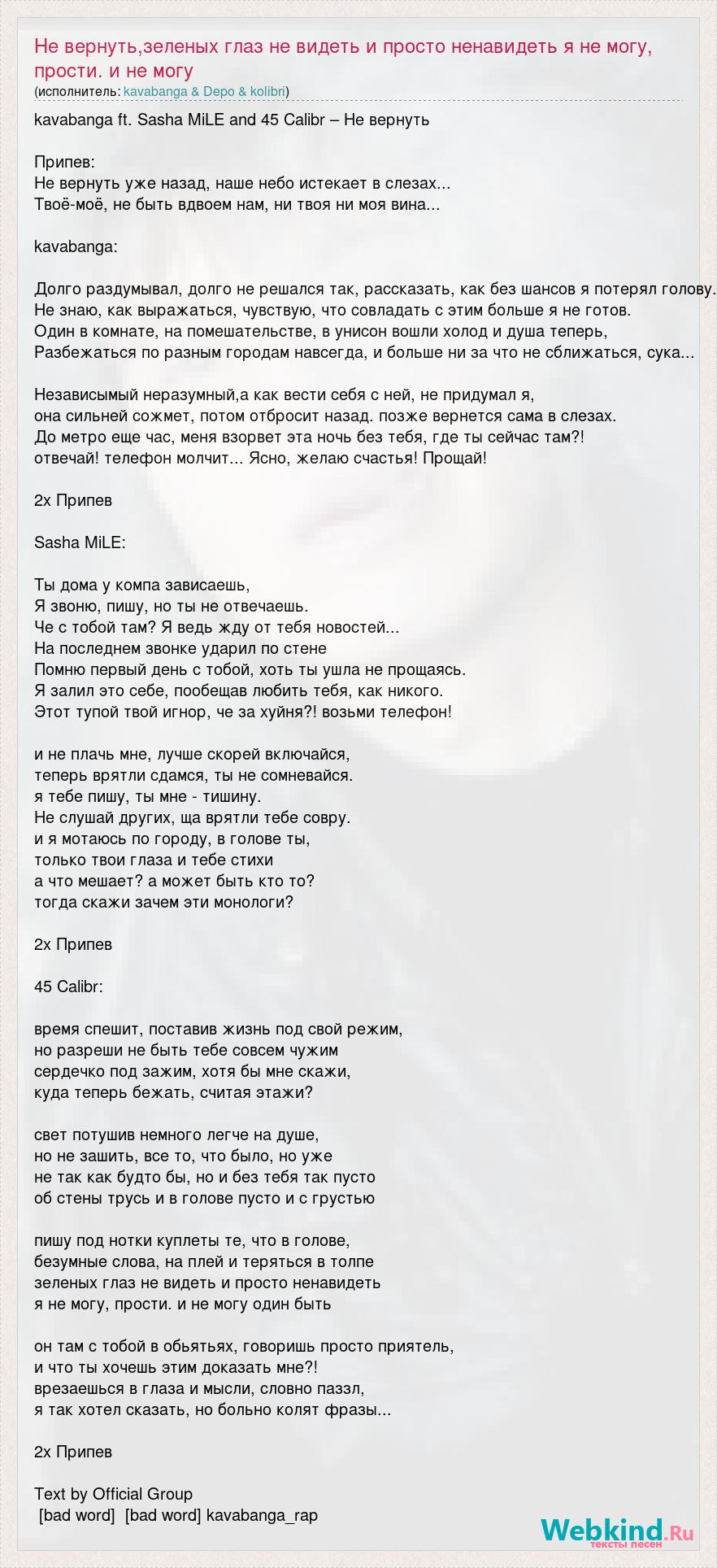 kavabanga ft. Sasha MiLE and 45 Calibr – Не вернуть Припев: Не вернуть уже назад, наше небо истекает в слезах... Твоё-моё, не быть вдвоем нам, ни твоя ни моя вина... kavabanga: Долго раздумывал, долго не решался так, рассказать, как без шансов я потерял голову. Не знаю, как выражаться, чувствую, что совладать с этим больше я не готов. Один в комнате, на помешательстве, в унисон вошли холод и душа теперь, Разбежаться по разным городам навсегда, и больше ни за что не сближаться, сука... Независымый неразумный,а как вести себя с ней, не придумал я, она сильней сожмет, потом отбросит назад. позже вернется сама в слезах. До метро еще час, меня взорвет эта ночь без тебя, где ты сейчас там?! отвечай! телефон молчит... Ясно, желаю счастья! Прощай! 2х Припев Sasha MiLE: Ты дома у компа зависаешь, Я звоню, пишу, но ты не отвечаешь. Че с тобой там? Я ведь жду от тебя новостей... На последнем звонке ударил по стене Помню первый день с тобой, хоть ты ушла не прощаясь. Я залил это себе, пообещав любить тебя, как никого. Этот тупой твой игнор, че за хуйня?! возьми телефон! и не плачь мне, лучше скорей включайся, теперь врятли сдамся, ты не сомневайся. я тебе пишу, ты мне - тишину. Не слушай других, ща врятли тебе совру. и я мотаюсь по городу, в голове ты, только твои глаза и тебе стихи а что мешает? а может быть кто то? тогда скажи зачем эти монологи? 2х Припев 45 Calibr: время спешит, поставив жизнь под свой режим, но разреши не быть тебе совсем чужим сердечко под зажим, хотя бы мне скажи, куда теперь бежать, считая этажи? свет потушив немного легче на душе, но не зашить, все то, что было, но уже не так как будто бы, но и без тебя так пусто об стены трусь и в голове пусто и с грустью пишу под нотки куплеты те, что в голове, безумные слова, на плей и теряться в толпе зеленых глаз не видеть и просто ненавидеть я не могу, прости. и не могу один быть он там с тобой в обьятьях, говоришь просто приятель, и что ты хочешь этим доказать мне?! врезаешься в глаза и мысли, словно паззл, я так хотел сказать, но больно колят фразы... 2х Припев Text by Official Group [bad word] [bad word] kavabanga_rap