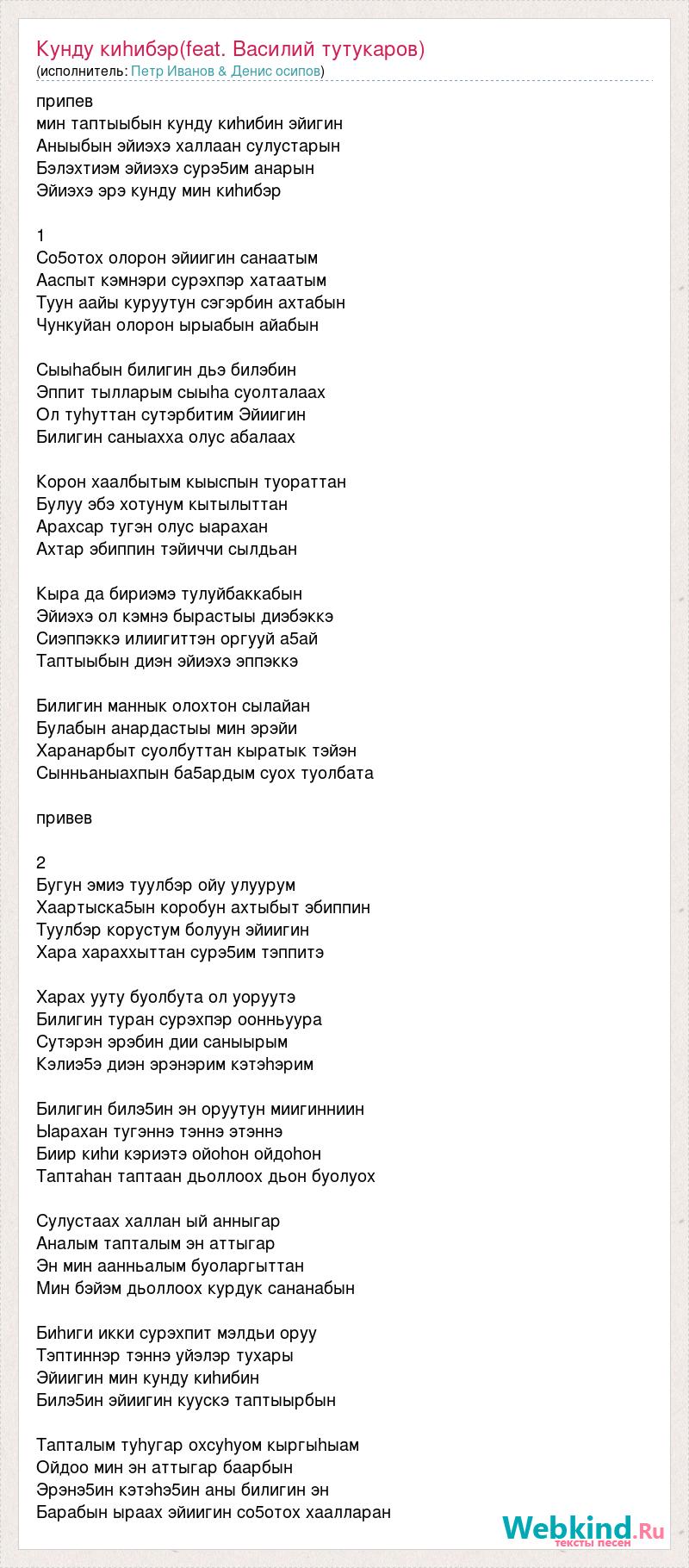 припев мин таптыыбын кунду киhибин эйигин Аныыбын эйиэхэ халлаан сулустарын Бэлэхтиэм эйиэхэ сурэ5им анарын Эйиэхэ эрэ кунду мин киhибэр 1 Со5отох олорон эйиигин санаатым Ааспыт кэмнэри сурэхпэр хатаатым Туун аайы куруутун сэгэрбин ахтабын Чункуйан олорон ырыабын айабын Сыыhабын билигин дьэ билэбин Эппит тылларым сыыhа суолталаах Ол туhуттан сутэрбитим Эйиигин Билигин саныахха олус абалаах Корон хаалбытым кыыспын туораттан Булуу эбэ хотунум кытылыттан Арахсар тугэн олус ыарахан Ахтар эбиппин тэйиччи сылдьан Кыра да бириэмэ тулуйбаккабын Эйиэхэ ол кэмнэ бырастыы диэбэккэ Сиэппэккэ илиигиттэн оргууй а5ай Таптыыбын диэн эйиэхэ эппэккэ Билигин маннык олохтон сылайан Булабын анардастыы мин эрэйи Харанарбыт суолбуттан кыратык тэйэн Сынньаныахпын ба5ардым суох туолбата привев 2 Бугун эмиэ туулбэр ойу улуурум Хаартыска5ын коробун ахтыбыт эбиппин Туулбэр корустум болуун эйиигин Хара хараххыттан сурэ5им тэппитэ Харах ууту буолбута ол уоруутэ Билигин туран сурэхпэр оонньуура Сутэрэн эрэбин дии саныырым Кэлиэ5э диэн эрэнэрим кэтэhэрим Билигин билэ5ин эн оруутун миигинниин Ыарахан тугэннэ тэннэ этэннэ Биир киhи кэриэтэ ойоhон ойдоhон Таптаhан таптаан дьоллоох дьон буолуох Сулустаах халлан ый анныгар Аналым тапталым эн аттыгар Эн мин аанньалым буоларгыттан Мин бэйэм дьоллоох курдук сананабын Биhиги икки сурэхпит мэлдьи оруу Тэптиннэр тэннэ уйэлэр тухары Эйиигин мин кунду киhибин Билэ5ин эйиигин куускэ таптыырбын Тапталым туhугар охсуhуом кыргыhыам Ойдоо мин эн аттыгар баарбын Эрэнэ5ин кэтэhэ5ин аны билигин эн Барабын ыраах эйиигин со5отох хаалларан