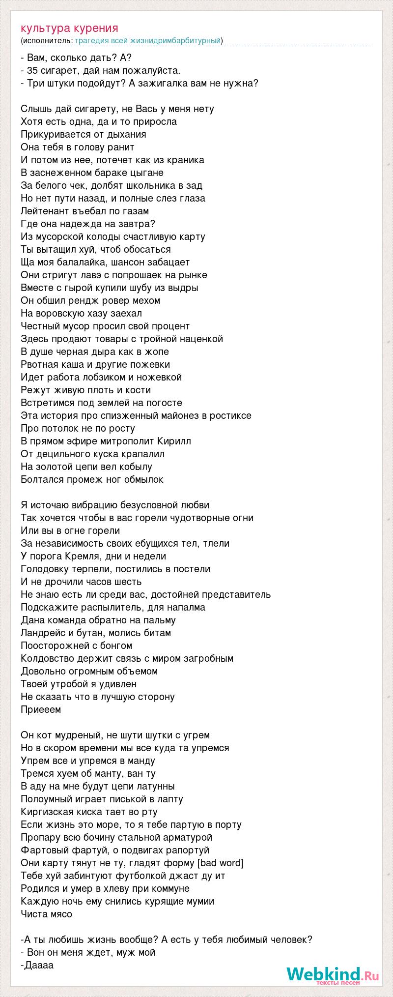 - Вам, сколько дать? А? - 35 сигарет, дай нам пожалуйста. - Три штуки подойдут? А зажигалка вам не нужна? Слышь дай сигарету, не Вась у меня нету Хотя есть одна, да и то приросла Прикуривается от дыхания Она тебя в голову ранит И потом из нее, потечет как из краника В заснеженном бараке цыгане За белого чек, долбят школьника в зад Но нет пути назад, и полные слез глаза Лейтенант въебал по газам Где она надежда на завтра? Из мусорской колоды счастливую карту Ты вытащил хуй, чтоб обосаться Ща моя балалайка, шансон забацает Они стригут лавэ с попрошаек на рынке Вместе с гырой купили шубу из выдры Он обшил рендж ровер мехом На воровскую хазу заехал Честный мусор просил свой процент Здесь продают товары с тройной наценкой В душе черная дыра как в жопе Рвотная каша и другие пожевки Идет работа лобзиком и ножевкой Режут живую плоть и кости Встретимся под землей на погосте Эта история про спизженный майонез в ростиксе Про потолок не по росту В прямом эфире митрополит Кирилл От децильного куска крапалил На золотой цепи вел кобылу Болтался промеж ног обмылок Я источаю вибрацию безусловной любви Так хочется чтобы в вас горели чудотворные огни Или вы в огне горели За независимость своих ебущихся тел, тлели У порога Кремля, дни и недели Голодовку терпели, постились в постели И не дрочили часов шесть Не знаю есть ли среди вас, достойней представитель Подскажите распылитель, для напалма Дана команда обратно на пальму Ландрейс и бутан, молись битам Поосторожней с бонгом Колдовство держит связь с миром загробным Довольно огромным объемом Твоей утробой я удивлен Не сказать что в лучшую сторону Приееем Он кот мудреный, не шути шутки с угрем Но в скором времени мы все куда та упремся Упрем все и упремся в манду Тремся хуем об манту, ван ту В аду на мне будут цепи латунны Полоумный играет писькой в лапту Киргизская киска тает во рту Если жизнь это море, то я тебе партую в порту Пропару всю бочину стальной арматурой Фартовый фартуй, о подвигах рапортуй Они карту тянут не ту, гладят форму [bad word] Тебе хуй забинтуют футболкой джаст ду ит Родился и умер в хлеву при коммуне Каждую ночь ему снились курящие мумии Чиста мясо -А ты любишь жизнь вообще? А есть у тебя любимый человек? - Вон он меня ждет, муж мой -Даааа
