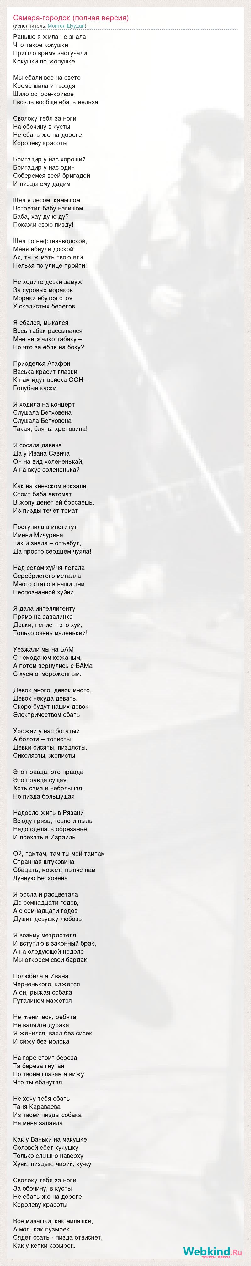 Раньше я жила не знала Что такое кокушки Пришло время застучали Кокушки по жопушке Мы ебали все на свете Кроме шила и гвоздя Шило острое-кривое Гвоздь вообще ебать нельзя Сволоку тебя за ноги На обочину в кусты Не ебать же на дороге Королеву красоты Бригадир у нас хороший Бригадир у нас один Соберемся всей бригадой И пизды ему дадим Шел я лесом, камышом Встретил бабу нагишом Баба, хау ду ю ду? Покажи свою пизду! Шел по нефтезаводской, Меня ебнули доской Ах, ты ж мать твою ети, Нельзя по улице пройти! Не ходите девки замуж За суровых моряков Моряки ебутся стоя У скалистых берегов Я ебался, мыкался Весь табак рассыпался Мне не жалко табаку – Но что за ебля на боку? Приоделся Агафон Васька красит глазки К нам идут войска ООН – Голубые каски Я ходила на концерт Слушала Бетховена Слушала Бетховена Такая, блять, хреновина! Я сосала давеча Да у Ивана Савича Он на вид холененькай, А на вкус солененькай Как на киевском вокзале Стоит баба автомат В жопу денег ей бросаешь, Из пизды течет томат Поступила в институт Имени Мичурина Так и знала – отъебут, Да просто сердцем чуяла! Над селом хуйня летала Серебристого металла Много стало в наши дни Неопознанной хуйни Я дала интеллигенту Прямо на завалинке Девки, пенис – это хуй, Только очень маленький! Уезжали мы на БАМ С чемоданом кожаным, А потом вернулись с БАМа С хуем отмороженным. Девок много, девок много, Девок некуда девать, Скоро будут наших девок Электричеством ебать Урожай у нас богатый А болота – тописты Девки сисяты, пиздясты, Сикелясты, жописты Это правда, это правда Это правда сущая Хоть сама и небольшая, Но пизда большущая Надоело жить в Рязани Всюду грязь, говно и пыль Надо сделать обрезанье И поехать в Израиль Ой, тамтам, там ты мой тамтам Странная штуковина Сбацать, может, нынче нам Лунную Бетховена Я росла и расцветала До семнадцати годов, А с семнадцати годов Душит девушку любовь Я возьму метрдотеля И вступлю в законный брак, А на следующей неделе Мы откроем свой бардак Полюбила я Ивана Черненького, кажется А он, рыжая собака Гуталином мажется Не женитеся, ребята Не валяйте дурака Я женился, взял без сисек И сижу без молока На горе стоит береза Та береза гнутая По твоим глазам я вижу, Что ты ебанутая Не хочу тебя ебать Таня Караваева Из твоей пизды собака На меня залаяла Как у Ваньки на макушке Соловей ебет кукушку Только слышно наверху Хуяк, пиздык, чирик, ку-ку Сволоку тебя за ноги За обочину, в кусты Не ебать же на дороге Королеву красоты Все милашки, как милашки, А моя, как пузырек. Сядет ссать - пизда отвиснет, Как у кепки козырек.