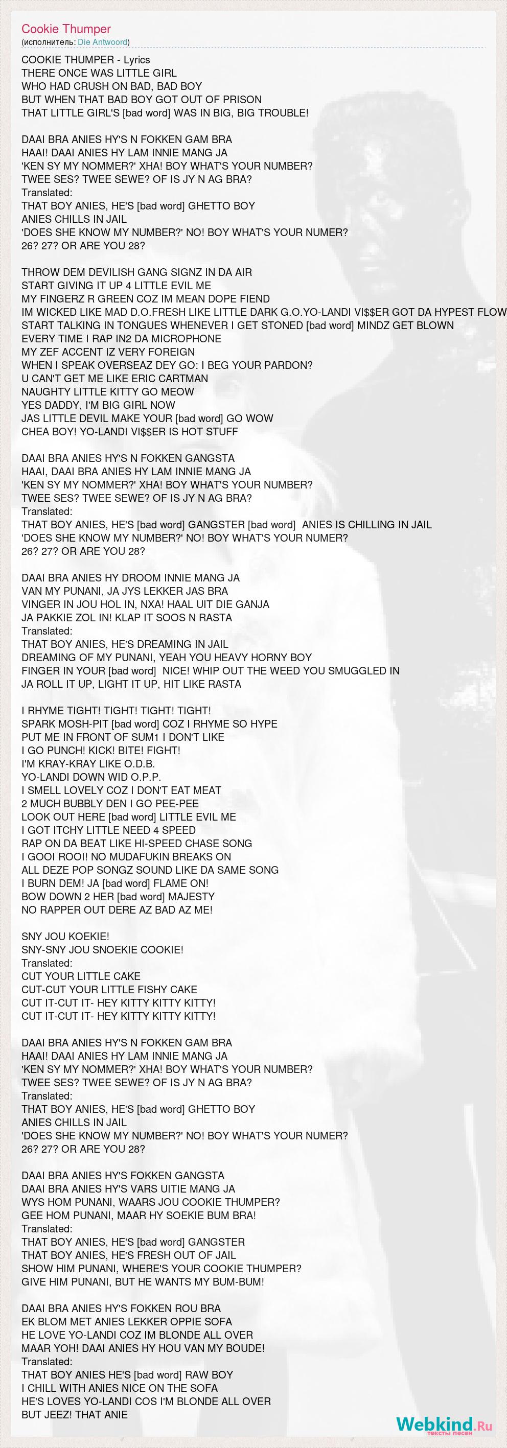COOKIE THUMPER - Lyrics THERE ONCE WAS LITTLE GIRL WHO HAD CRUSH ON BAD, BAD BOY BUT WHEN THAT BAD BOY GOT OUT OF PRISON THAT LITTLE GIRL'S [bad word] WAS IN BIG, BIG TROUBLE! DAAI BRA ANIES HY'S N FOKKEN GAM BRA HAAI! DAAI ANIES HY LAM INNIE MANG JA 'KEN SY MY NOMMER?' XHA! BOY WHAT'S YOUR NUMBER? TWEE SES? TWEE SEWE? OF IS JY N AG BRA? Translated: THAT BOY ANIES, HE'S [bad word] GHETTO BOY ANIES CHILLS IN JAIL 'DOES SHE KNOW MY NUMBER?' NO! BOY WHAT'S YOUR NUMER? 26? 27? OR ARE YOU 28? THROW DEM DEVILISH GANG SIGNZ IN DA AIR START GIVING IT UP 4 LITTLE EVIL ME MY FINGERZ R GREEN COZ IM MEAN DOPE FIEND IM WICKED LIKE MAD D.O.FRESH LIKE LITTLE DARK G.O.YO-LANDI VI$$ER GOT DA HYPEST FLOW START TALKING IN TONGUES WHENEVER I GET STONED [bad word] MINDZ GET BLOWN EVERY TIME I RAP IN2 DA MICROPHONE MY ZEF ACCENT IZ VERY FOREIGN WHEN I SPEAK OVERSEAZ DEY GO: I BEG YOUR PARDON? U CAN'T GET ME LIKE ERIC CARTMAN NAUGHTY LITTLE KITTY GO MEOW YES DADDY, I'M BIG GIRL NOW JAS LITTLE DEVIL MAKE YOUR [bad word] GO WOW CHEA BOY! YO-LANDI VI$$ER IS HOT STUFF DAAI BRA ANIES HY'S N FOKKEN GANGSTA HAAI, DAAI BRA ANIES HY LAM INNIE MANG JA 'KEN SY MY NOMMER?' XHA! BOY WHAT'S YOUR NUMBER? TWEE SES? TWEE SEWE? OF IS JY N AG BRA? Translated: THAT BOY ANIES, HE'S [bad word] GANGSTER [bad word] ANIES IS CHILLING IN JAIL 'DOES SHE KNOW MY NUMBER?' NO! BOY WHAT'S YOUR NUMER? 26? 27? OR ARE YOU 28? DAAI BRA ANIES HY DROOM INNIE MANG JA VAN MY PUNANI, JA JYS LEKKER JAS BRA VINGER IN JOU HOL IN, NXA! HAAL UIT DIE GANJA JA PAKKIE ZOL IN! KLAP IT SOOS N RASTA Translated: THAT BOY ANIES, HE'S DREAMING IN JAIL DREAMING OF MY PUNANI, YEAH YOU HEAVY HORNY BOY FINGER IN YOUR [bad word] NICE! WHIP OUT THE WEED YOU SMUGGLED IN JA ROLL IT UP, LIGHT IT UP, HIT LIKE RASTA I RHYME TIGHT! TIGHT! TIGHT! TIGHT! SPARK MOSH-PIT [bad word] COZ I RHYME SO HYPE PUT ME IN FRONT OF SUM1 I DON'T LIKE I GO PUNCH! KICK! BITE! FIGHT! I'M KRAY-KRAY LIKE O.D.B. YO-LANDI DOWN WID O.P.P. I SMELL LOVELY COZ I DON'T EAT MEAT 2 MUCH BUBBLY DEN I GO PEE-PEE LOOK OUT HERE [bad word] LITTLE EVIL ME I GOT ITCHY LITTLE NEED 4 SPEED RAP ON DA BEAT LIKE HI-SPEED CHASE SONG I GOOI ROOI! NO MUDAFUKIN BREAKS ON ALL DEZE POP SONGZ SOUND LIKE DA SAME SONG I BURN DEM! JA [bad word] FLAME ON! BOW DOWN 2 HER [bad word] MAJESTY NO RAPPER OUT DERE AZ BAD AZ ME! SNY JOU KOEKIE! SNY-SNY JOU SNOEKIE COOKIE! Translated: CUT YOUR LITTLE CAKE CUT-CUT YOUR LITTLE FISHY CAKE CUT IT-CUT IT- HEY KITTY KITTY KITTY! CUT IT-CUT IT- HEY KITTY KITTY KITTY! DAAI BRA ANIES HY'S N FOKKEN GAM BRA HAAI! DAAI ANIES HY LAM INNIE MANG JA 'KEN SY MY NOMMER?' XHA! BOY WHAT'S YOUR NUMBER? TWEE SES? TWEE SEWE? OF IS JY N AG BRA? Translated: THAT BOY ANIES, HE'S [bad word] GHETTO BOY ANIES CHILLS IN JAIL 'DOES SHE KNOW MY NUMBER?' NO! BOY WHAT'S YOUR NUMER? 26? 27? OR ARE YOU 28? DAAI BRA ANIES HY'S FOKKEN GANGSTA DAAI BRA ANIES HY'S VARS UITIE MANG JA WYS HOM PUNANI, WAARS JOU COOKIE THUMPER? GEE HOM PUNANI, MAAR HY SOEKIE BUM BRA! Translated: THAT BOY ANIES, HE'S [bad word] GANGSTER THAT BOY ANIES, HE'S FRESH OUT OF JAIL SHOW HIM PUNANI, WHERE'S YOUR COOKIE THUMPER? GIVE HIM PUNANI, BUT HE WANTS MY BUM-BUM! DAAI BRA ANIES HY'S FOKKEN ROU BRA EK BLOM MET ANIES LEKKER OPPIE SOFA HE LOVE YO-LANDI COZ IM BLONDE ALL OVER MAAR YOH! DAAI ANIES HY HOU VAN MY BOUDE! Translated: THAT BOY ANIES HE'S [bad word] RAW BOY I CHILL WITH ANIES NICE ON THE SOFA HE'S LOVES YO-LANDI COS I'M BLONDE ALL OVER BUT JEEZ! THAT ANIE