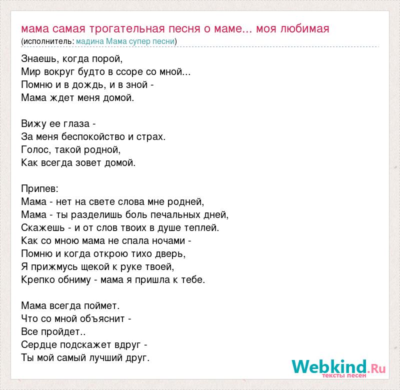 Знаешь, когда порой, Мир вокруг будто в ссоре со мной... Помню и в дождь, и в зной - Мама ждет меня домой. Вижу ее глаза - За меня беспокойство и страх. Голос, такой родной, Как всегда зовет домой. Припев: Мама - нет на свете слова мне родней, Мама - ты разделишь боль печальных дней, Скажешь - и от слов твоих в душе теплей. Как со мною мама не спала ночами - Помню и когда открою тихо дверь, Я прижмусь щекой к руке твоей, Крепко обниму - мама я пришла к тебе. Мама всегда поймет. Что со мной объяснит - Все пройдет.. Сердце подскажет вдруг - Ты мой самый лучший друг.