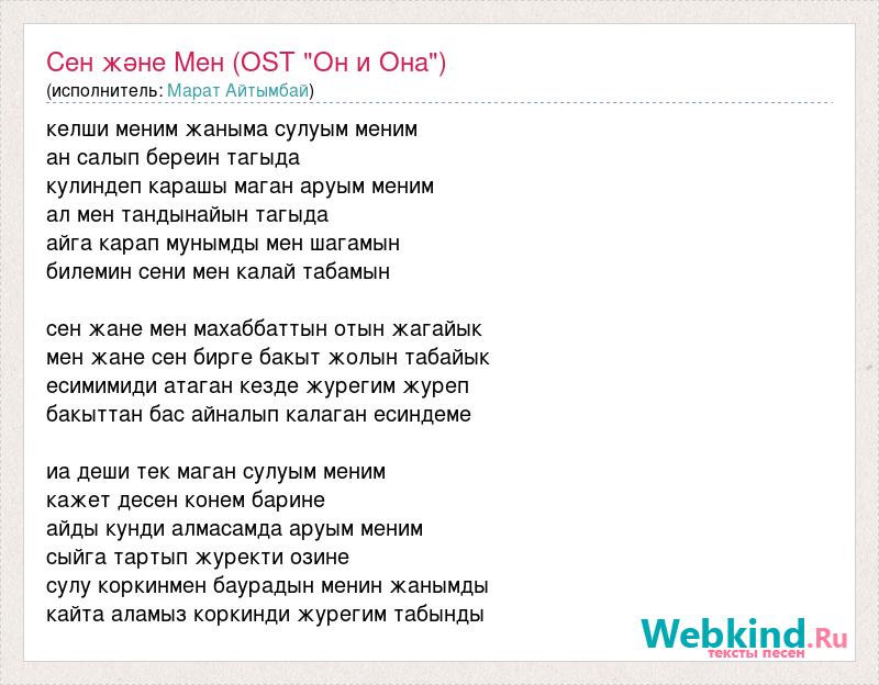 келши меним жаныма сулуым меним ан салып береин тагыда кулиндеп карашы маган аруым меним ал мен тандынайын тагыда айга карап мунымды мен шагамын билемин сени мен калай табамын сен жане мен махаббаттын отын жагайык мен жане сен бирге бакыт жолын табайык есимимиди атаган кезде журегим журеп бакыттан бас айналып калаган есиндеме иа деши тек маган сулуым меним кажет десен конем барине айды кунди алмасамда аруым меним сыйга тартып журекти озине сулу коркинмен баурадын менин жанымды кайта аламыз коркинди журегим табынды