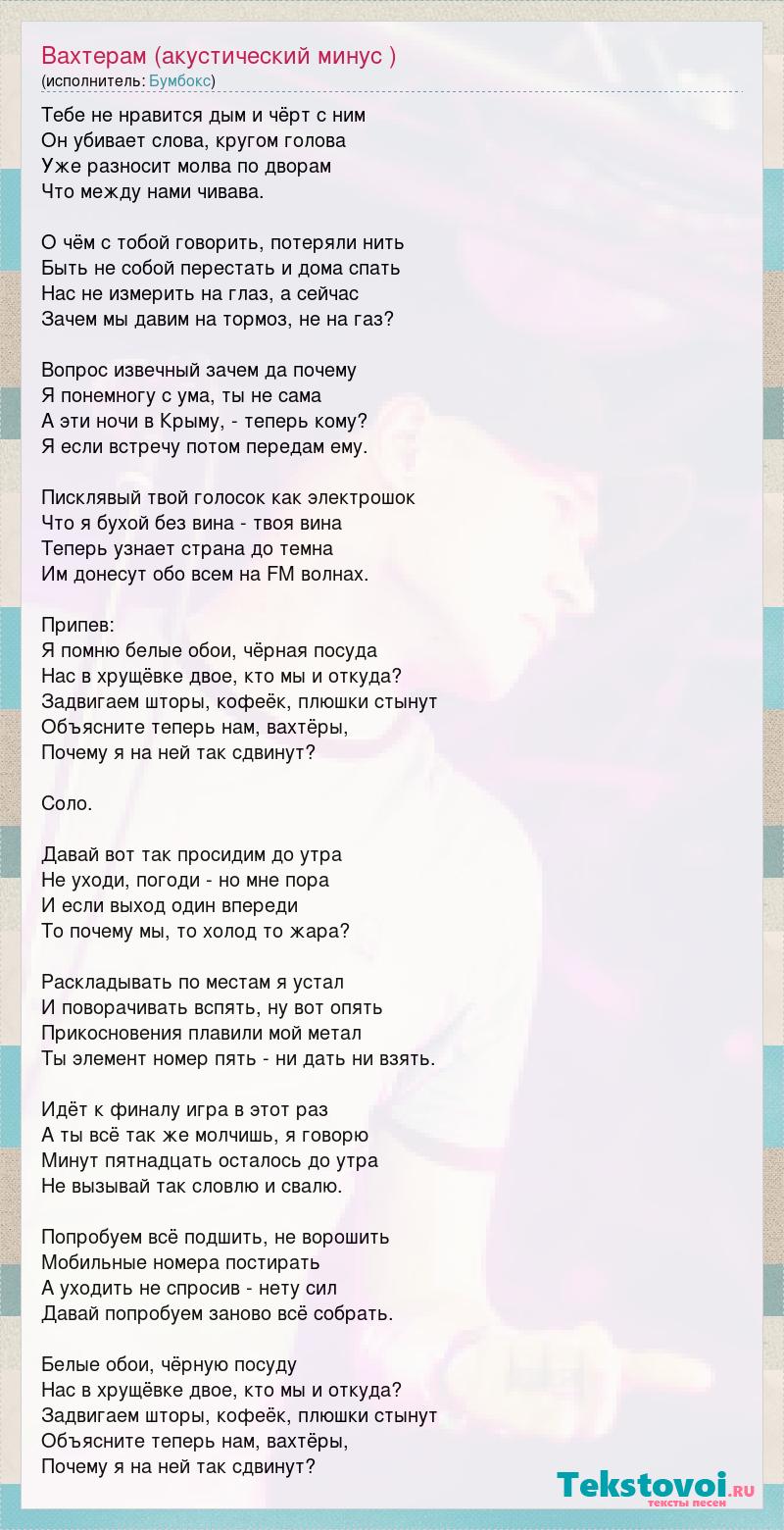 Тебе не нравится дым и чёрт с ним Он убивает слова, кругом голова Уже разносит молва по дворам Что между нами чивава. О чём с тобой говорить, потеряли нить Быть не собой перестать и дома спать Нас не измерить на глаз, а сейчас Зачем мы давим на тормоз, не на газ? Вопрос извечный зачем да почему Я понемногу с ума, ты не сама А эти ночи в Крыму, - теперь кому? Я если встречу потом передам ему. Писклявый твой голосок как электрошок Что я бухой без вина - твоя вина Теперь узнает страна до темна Им донесут обо всем на FM волнах. Припев: Я помню белые обои, чёрная посуда Нас в хрущёвке двое, кто мы и откуда? Задвигаем шторы, кофеёк, плюшки стынут Объясните теперь нам, вахтёры, Почему я на ней так сдвинут? Соло. Давай вот так просидим до утра Не уходи, погоди - но мне пора И если выход один впереди То почему мы, то холод то жара? Раскладывать по местам я устал И поворачивать вспять, ну вот опять Прикосновения плавили мой метал Ты элемент номер пять - ни дать ни взять. Идёт к финалу игра в этот раз А ты всё так же молчишь, я говорю Минут пятнадцать осталось до утра Не вызывай так словлю и свалю. Попробуем всё подшить, не ворошить Мобильные номера постирать А уходить не спросив - нету сил Давай попробуем заново всё собрать. Белые обои, чёрную посуду Нас в хрущёвке двое, кто мы и откуда? Задвигаем шторы, кофеёк, плюшки стынут Объясните теперь нам, вахтёры, Почему я на ней так сдвинут?