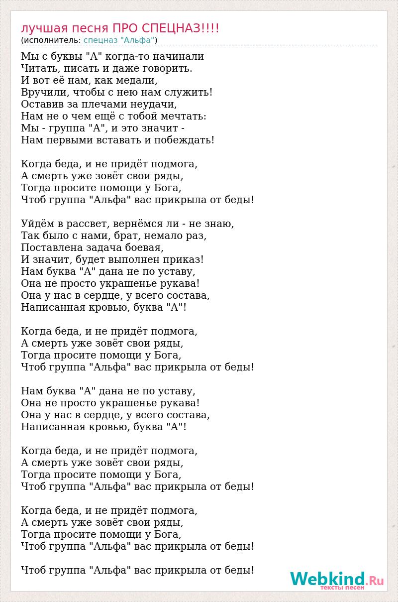 Мы с буквы "А" когда-то начинали Читать, писать и даже говорить. И вот её нам, как медали, Вручили, чтобы с нею нам служить! Оставив за плечами неудачи, Нам не о чем ещё с тобой мечтать: Мы - группа "А", и это значит - Нам первыми вставать и побеждать! Когда беда, и не придёт подмога, А смерть уже зовёт свои ряды, Тогда просите помощи у Бога, Чтоб группа "Альфа" вас прикрыла от беды! Уйдём в рассвет, вернёмся ли - не знаю, Так было с нами, брат, немало раз, Поставлена задача боевая, И значит, будет выполнен приказ! Нам буква "А" дана не по уставу, Она не просто украшенье рукава! Она у нас в сердце, у всего состава, Написанная кровью, буква "А"! Когда беда, и не придёт подмога, А смерть уже зовёт свои ряды, Тогда просите помощи у Бога, Чтоб группа "Альфа" вас прикрыла от беды! Нам буква "А" дана не по уставу, Она не просто украшенье рукава! Она у нас в сердце, у всего состава, Написанная кровью, буква "А"! Когда беда, и не придёт подмога, А смерть уже зовёт свои ряды, Тогда просите помощи у Бога, Чтоб группа "Альфа" вас прикрыла от беды! Когда беда, и не придёт подмога, А смерть уже зовёт свои ряды, Тогда просите помощи у Бога, Чтоб группа "Альфа" вас прикрыла от беды! Чтоб группа "Альфа" вас прикрыла от беды!