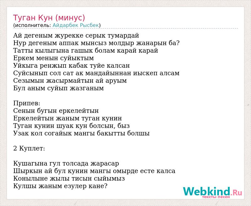 Ай дегеным журекке серык тумардай Нур дегеным аппак мынсыз молдыр жанарын ба? Татты кылыгына гашык болам карай карай Еркем менын суйыктым Уйкыга ренжып кабак туйе калсан Суйсынып сол сат ак мандайыннан иыскеп алсам Сезымын жасырмайтын ай аруым Бул аным суйып жазганым Припев: Сенын бугын еркелейтын Еркелейтын жаным туган кунин Туган кунин шуак кун болсын, быз Узак кол согайык мангы бакытты болшы 2 Куплет: Кушагына гул толсада жарасар Шыркын ай бул кунин мангы омырде есте калса Конылыне жылы тисын сыйымыз Кулшы жаным езулер кане?