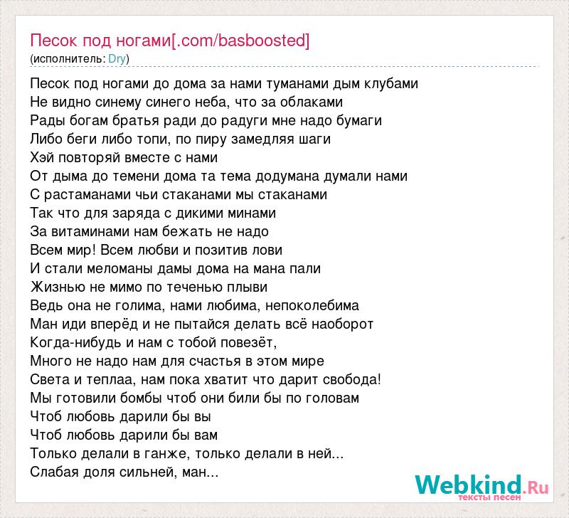 Песок под ногами до дома за нами туманами дым клубами Не видно синему синего неба, что за облаками Рады богам братья ради до радуги мне надо бумаги Либо беги либо топи, по пиру замедляя шаги Хэй повторяй вместе с нами От дыма до темени дома та тема додумана думали нами С растаманами чьи стаканами мы стаканами Так что для заряда с дикими минами За витаминами нам бежать не надо Всем мир! Всем любви и позитив лови И стали меломаны дамы дома на мана пали Жизнью не мимо по теченью плыви Ведь она не голима, нами любима, непоколебима Ман иди вперёд и не пытайся делать всё наоборот Когда-нибудь и нам с тобой повезёт, Много не надо нам для счастья в этом мире Света и теплаа, нам пока хватит что дарит свобода! Мы готовили бомбы чтоб они били бы по головам Чтоб любовь дарили бы вы Чтоб любовь дарили бы вам Только делали в ганже, только делали в ней... Слабая доля сильней, ман...