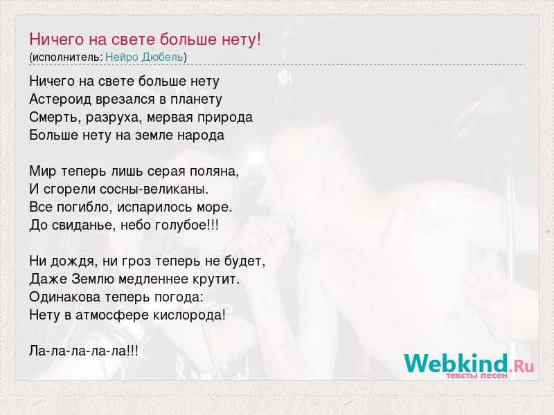 Ничего на свете больше нету Астероид врезался в планету Смерть, разруха, мервая природа Больше нету на земле народа Мир теперь лишь серая поляна, И сгорели сосны-великаны. Все погибло, испарилось море. До свиданье, небо голубое!!! Ни дождя, ни гроз теперь не будет, Даже Землю медленнее крутит. Одинакова теперь погода: Нету в атмосфере кислорода! Ла-ла-ла-ла-ла!!!