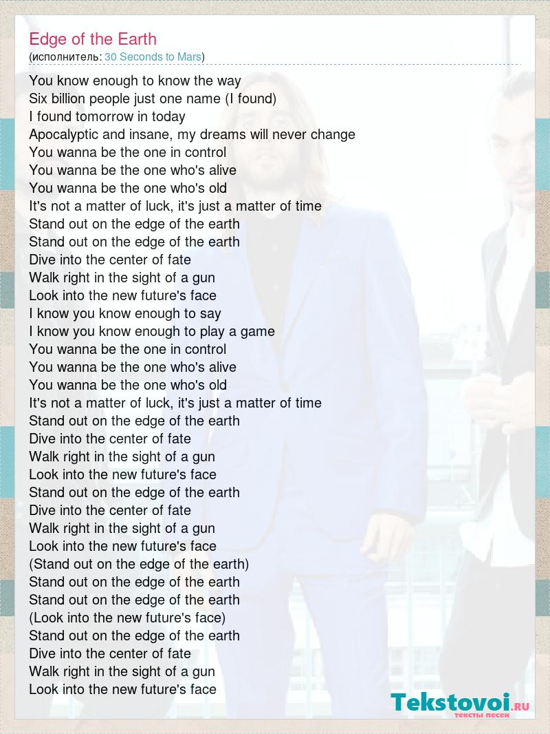 You know enough to know the way Six billion people just one name (I found) I found tomorrow in today Apocalyptic and insane, my dreams will never change You wanna be the one in control You wanna be the one who's alive You wanna be the one who's old It's not a matter of luck, it's just a matter of time Stand out on the edge of the earth Stand out on the edge of the earth Dive into the center of fate Walk right in the sight of a gun Look into the new future's face I know you know enough to say I know you know enough to play a game You wanna be the one in control You wanna be the one who's alive You wanna be the one who's old It's not a matter of luck, it's just a matter of time Stand out on the edge of the earth Dive into the center of fate Walk right in the sight of a gun Look into the new future's face Stand out on the edge of the earth Dive into the center of fate Walk right in the sight of a gun Look into the new future's face (Stand out on the edge of the earth) Stand out on the edge of the earth Stand out on the edge of the earth (Look into the new future's face) Stand out on the edge of the earth Dive into the center of fate Walk right in the sight of a gun Look into the new future's face