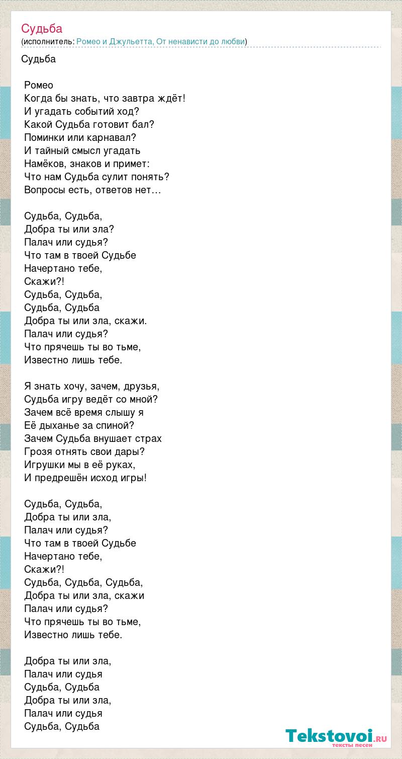 Судьба Ромео Когда бы знать, что завтра ждёт! И угадать событий ход? Какой Судьба готовит бал? Поминки или карнавал? И тайный смысл угадать Намёков, знаков и примет: Что нам Судьба сулит понять? Вопросы есть, ответов нет… Судьба, Судьба, Добра ты или зла? Палач или судья? Что там в твоей Судьбе Начертано тебе, Скажи?! Судьба, Судьба, Судьба, Судьба Добра ты или зла, скажи. Палач или судья? Что прячешь ты во тьме, Известно лишь тебе. Я знать хочу, зачем, друзья, Судьба игру ведёт со мной? Зачем всё время слышу я Её дыханье за спиной? Зачем Судьба внушает страх Грозя отнять свои дары? Игрушки мы в её руках, И предрешён исход игры! Судьба, Судьба, Добра ты или зла, Палач или судья? Что там в твоей Судьбе Начертано тебе, Скажи?! Судьба, Судьба, Судьба, Добра ты или зла, скажи Палач или судья? Что прячешь ты во тьме, Известно лишь тебе. Добра ты или зла, Палач или судья Судьба, Судьба Добра ты или зла, Палач или судья Судьба, Судьба