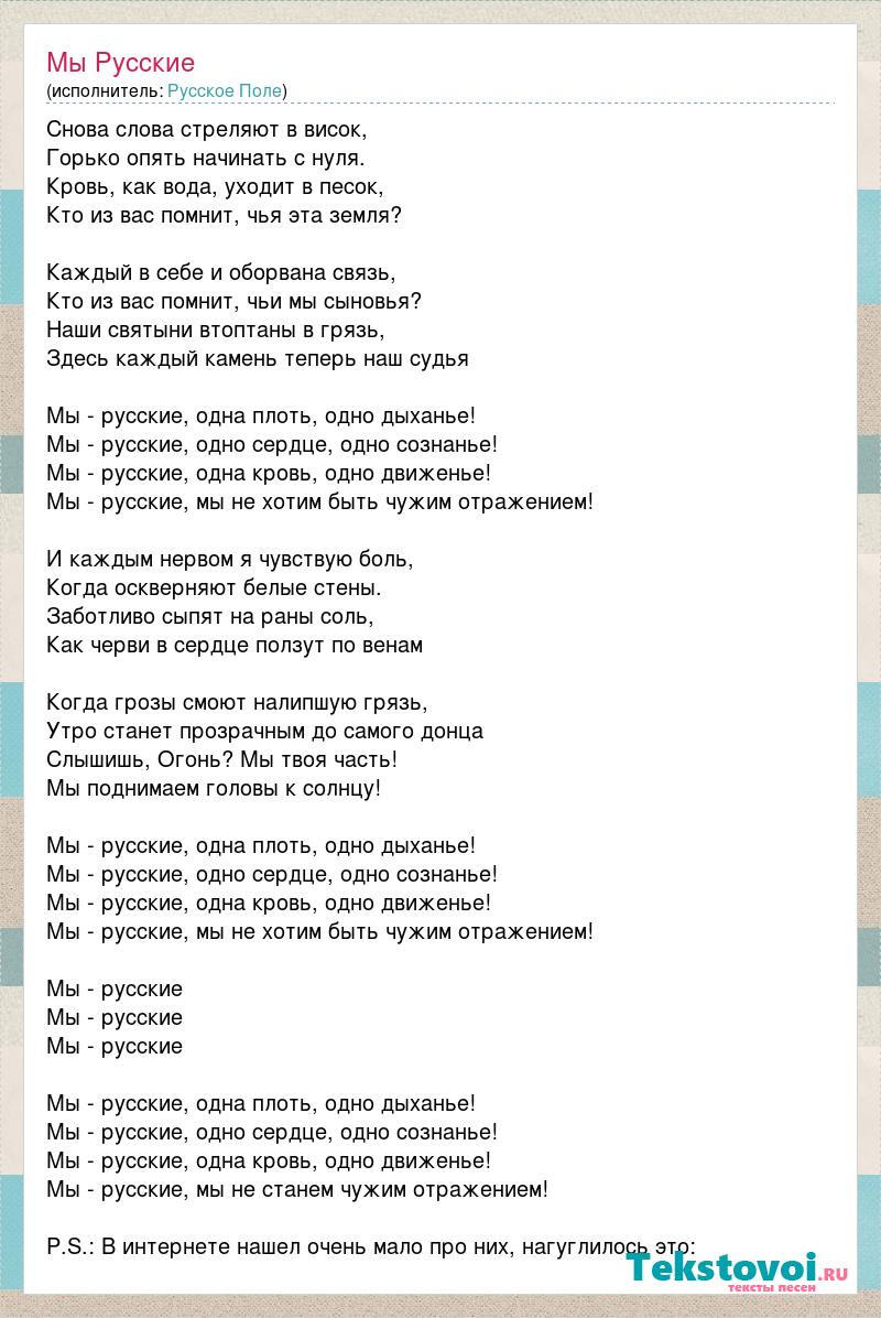 Снова слова стреляют в висок, Горько опять начинать с нуля. Кровь, как вода, уходит в песок, Кто из вас помнит, чья эта земля? Каждый в себе и оборвана связь, Кто из вас помнит, чьи мы сыновья? Наши святыни втоптаны в грязь, Здесь каждый камень теперь наш судья Мы - русские, одна плоть, одно дыханье! Мы - русские, одно сердце, одно сознанье! Мы - русские, одна кровь, одно движенье! Мы - русские, мы не хотим быть чужим отражением! И каждым нервом я чувствую боль, Когда оскверняют белые стены. Заботливо сыпят на раны соль, Как черви в сердце ползут по венам Когда грозы смоют налипшую грязь, Утро станет прозрачным до самого донца Слышишь, Огонь? Мы твоя часть! Мы поднимаем головы к солнцу! Мы - русские, одна плоть, одно дыханье! Мы - русские, одно сердце, одно сознанье! Мы - русские, одна кровь, одно движенье! Мы - русские, мы не хотим быть чужим отражением! Мы - русские Мы - русские Мы - русские Мы - русские, одна плоть, одно дыханье! Мы - русские, одно сердце, одно сознанье! Мы - русские, одна кровь, одно движенье! Мы - русские, мы не станем чужим отражением! P.S.: В интернете нашел очень мало про них, нагуглилось это: