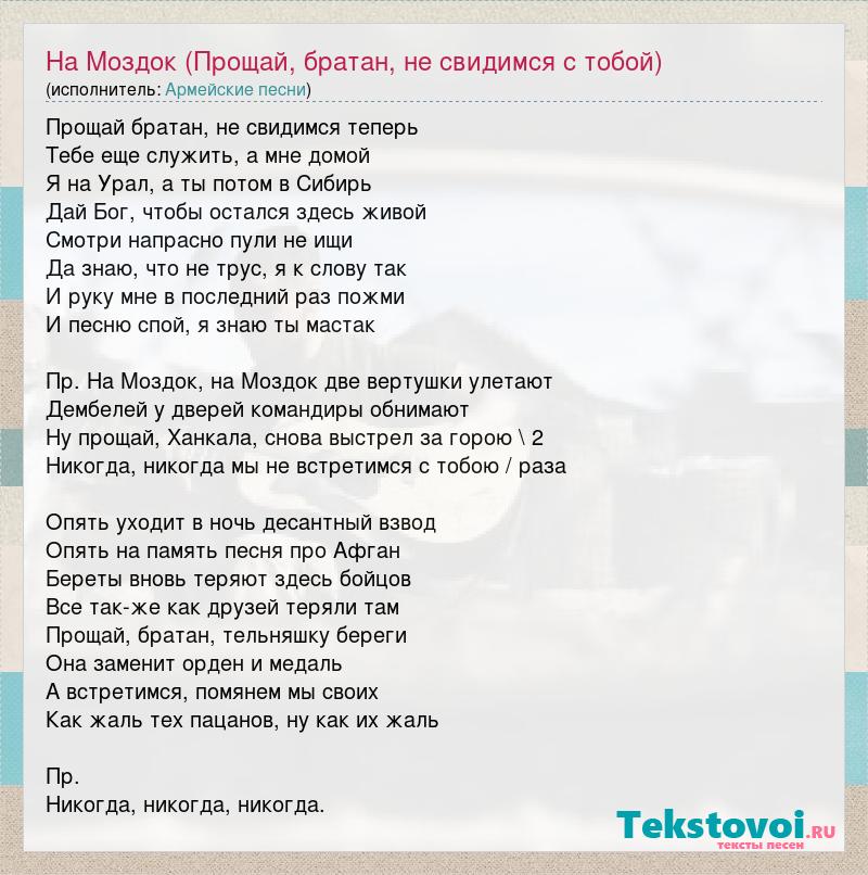 Прощай братан, не свидимся теперь Тебе еще служить, а мне домой Я на Урал, а ты потом в Сибирь Дай Бог, чтобы остался здесь живой Смотри напрасно пули не ищи Да знаю, что не трус, я к слову так И руку мне в последний раз пожми И песню спой, я знаю ты мастак Пр. На Моздок, на Моздок две вертушки улетают Дембелей у дверей командиры обнимают Ну прощай, Ханкала, снова выстрел за горою \ 2 Никогда, никогда мы не встретимся с тобою / раза Опять уходит в ночь десантный взвод Опять на память песня про Афган Береты вновь теряют здесь бойцов Все так-же как друзей теряли там Прощай, братан, тельняшку береги Она заменит орден и медаль А встретимся, помянем мы своих Как жаль тех пацанов, ну как их жаль Пр. Никогда, никогда, никогда.