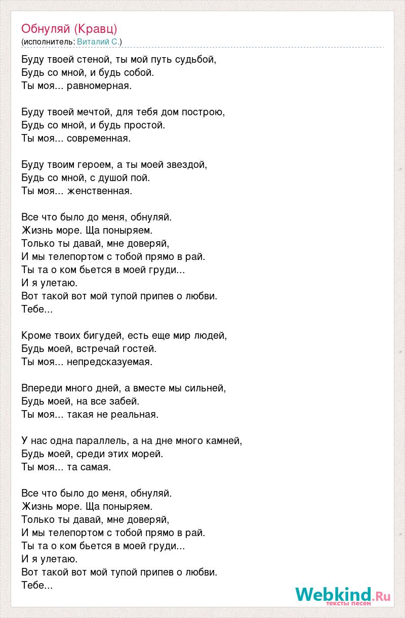 Буду твоей стеной, ты мой путь судьбой, Будь со мной, и будь собой. Ты моя... равномерная. Буду твоей мечтой, для тебя дом построю, Будь со мной, и будь простой. Ты моя... современная. Буду твоим героем, а ты моей звездой, Будь со мной, с душой пой. Ты моя... женственная. Все что было до меня, обнуляй. Жизнь море. Ща поныряем. Только ты давай, мне доверяй, И мы телепортом с тобой прямо в рай. Ты та о ком бьется в моей груди... И я улетаю. Вот такой вот мой тупой припев о любви. Тебе... Кроме твоих бигудей, есть еще мир людей, Будь моей, встречай гостей. Ты моя... непредсказуемая. Впереди много дней, а вместе мы сильней, Будь моей, на все забей. Ты моя... такая не реальная. У нас одна параллель, а на дне много камней, Будь моей, среди этих морей. Ты моя... та самая. Все что было до меня, обнуляй. Жизнь море. Ща поныряем. Только ты давай, мне доверяй, И мы телепортом с тобой прямо в рай. Ты та о ком бьется в моей груди... И я улетаю. Вот такой вот мой тупой припев о любви. Тебе...