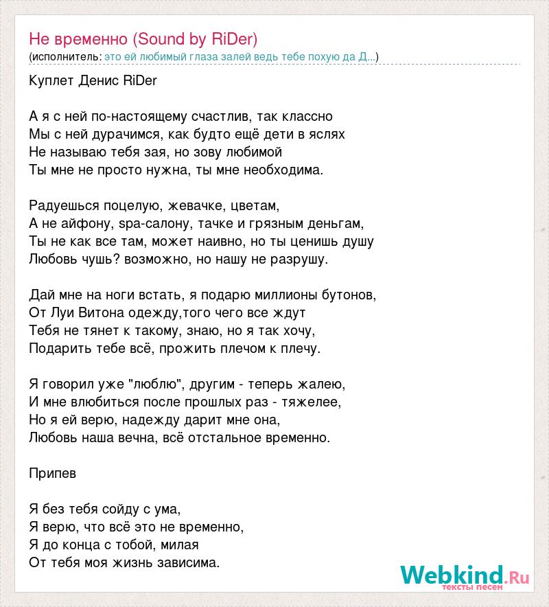 Куплет Денис RiDer А я с ней по-настоящему счастлив, так классно Мы с ней дурачимся, как будто ещё дети в яслях Не называю тебя зая, но зову любимой Ты мне не просто нужна, ты мне необходима. Радуешься поцелую, жевачке, цветам, А не айфону, spa-салону, тачке и грязным деньгам, Ты не как все там, может наивно, но ты ценишь душу Любовь чушь? возможно, но нашу не разрушу. Дай мне на ноги встать, я подарю миллионы бутонов, От Луи Витона одежду,того чего все ждут Тебя не тянет к такому, знаю, но я так хочу, Подарить тебе всё, прожить плечом к плечу. Я говорил уже "люблю", другим - теперь жалею, И мне влюбиться после прошлых раз - тяжелее, Но я ей верю, надежду дарит мне она, Любовь наша вечна, всё отстальное временно. Припев Я без тебя сойду с ума, Я верю, что всё это не временно, Я до конца с тобой, милая От тебя моя жизнь зависима.