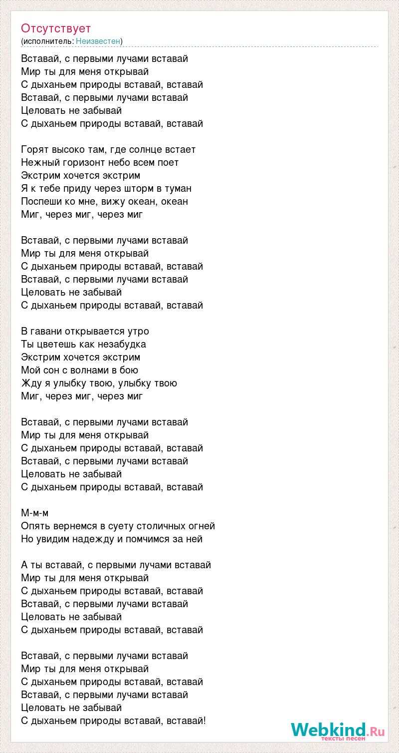 Вставай, с первыми лучами вставай Мир ты для меня открывай С дыханьем природы вставай, вставай Вставай, с первыми лучами вставай Целовать не забывай С дыханьем природы вставай, вставай Горят высоко там, где солнце встает Нежный горизонт небо всем поет Экстрим хочется экстрим Я к тебе приду через шторм в туман Поспеши ко мне, вижу океан, океан Миг, через миг, через миг Вставай, с первыми лучами вставай Мир ты для меня открывай С дыханьем природы вставай, вставай Вставай, с первыми лучами вставай Целовать не забывай С дыханьем природы вставай, вставай В гавани открывается утро Ты цветешь как незабудка Экстрим хочется экстрим Мой сон с волнами в бою Жду я улыбку твою, улыбку твою Миг, через миг, через миг Вставай, с первыми лучами вставай Мир ты для меня открывай С дыханьем природы вставай, вставай Вставай, с первыми лучами вставай Целовать не забывай С дыханьем природы вставай, вставай М-м-м Опять вернемся в суету столичных огней Но увидим надежду и помчимся за ней А ты вставай, с первыми лучами вставай Мир ты для меня открывай С дыханьем природы вставай, вставай Вставай, с первыми лучами вставай Целовать не забывай С дыханьем природы вставай, вставай Вставай, с первыми лучами вставай Мир ты для меня открывай С дыханьем природы вставай, вставай Вставай, с первыми лучами вставай Целовать не забывай С дыханьем природы вставай, вставай!