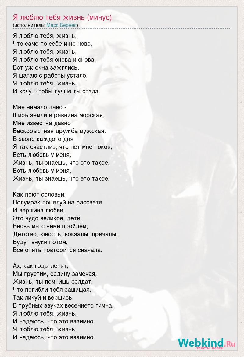 Я люблю тебя, жизнь, Что само по себе и не ново, Я люблю тебя, жизнь, Я люблю тебя снова и снова. Вот уж окна зажглись, Я шагаю с работы устало, Я люблю тебя, жизнь, И хочу, чтобы лучше ты стала. Мне немало дано - Ширь земли и равнина морская, Мне известна давно Бескорыстная дружба мужская. В звоне каждого дня Я так счастлив, что нет мне покоя, Есть любовь у меня, Жизнь, ты знаешь, что это такое. Есть любовь у меня, Жизнь, ты знаешь, что это такое. Как поют соловьи, Полумрак поцелуй на рассвете И вершина любви, Это чудо великое, дети. Вновь мы с ними пройдём, Детство, юность, вокзалы, причалы, Будут внуки потом, Все опять повторится сначала. Ах, как годы летят, Мы грустим, седину замечая, Жизнь, ты помнишь солдат, Что погибли тебя защищая. Так ликуй и вершись В трубных звуках весеннего гимна, Я люблю тебя, жизнь, И надеюсь, что это взаимно. Я люблю тебя, жизнь, И надеюсь, что это взаимно.