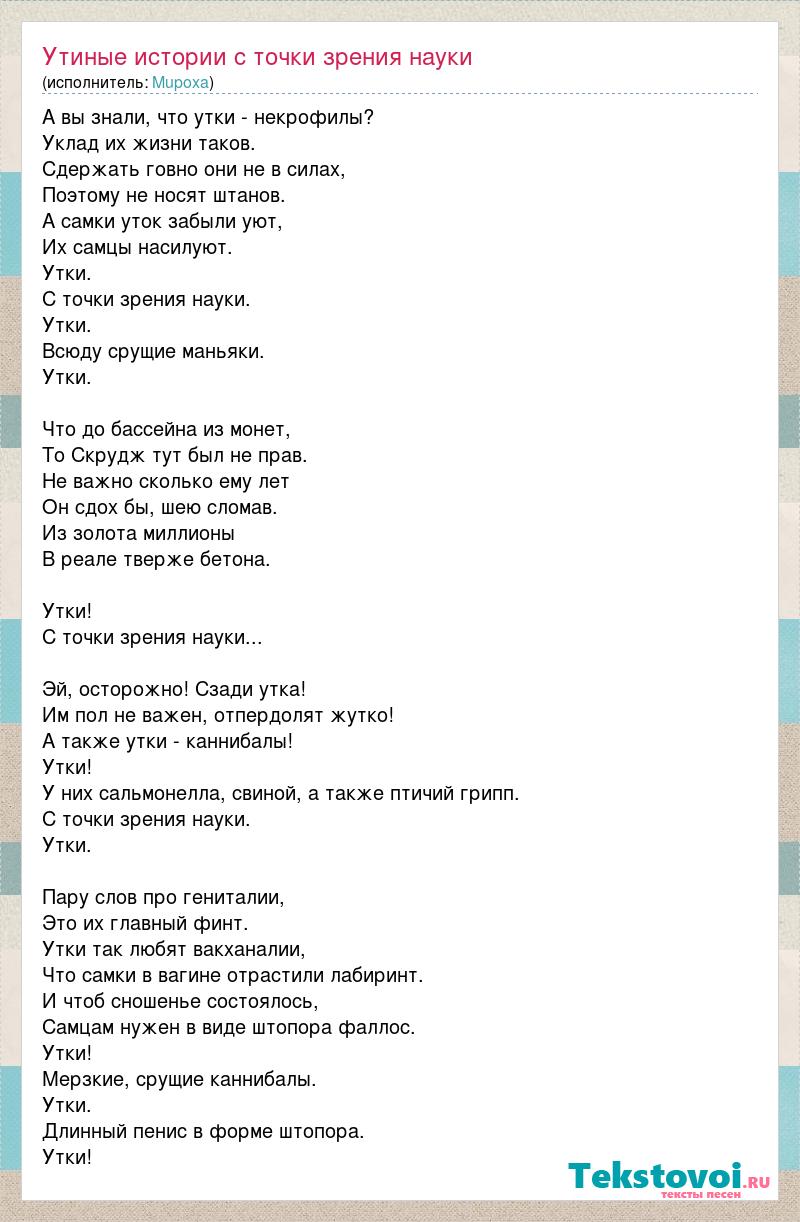 А вы знали, что утки - некрофилы? Уклад их жизни таков. Сдержать говно они не в силах, Поэтому не носят штанов. А самки уток забыли уют, Их самцы насилуют. Утки. С точки зрения науки. Утки. Всюду срущие маньяки. Утки. Что до бассейна из монет, То Скрудж тут был не прав. Не важно сколько ему лет Он сдох бы, шею сломав. Из золота миллионы В реале тверже бетона. Утки! С точки зрения науки... Эй, осторожно! Сзади утка! Им пол не важен, отпердолят жутко! А также утки - каннибалы! Утки! У них сальмонелла, свиной, а также птичий грипп. С точки зрения науки. Утки. Пару слов про гениталии, Это их главный финт. Утки так любят вакханалии, Что самки в вагине отрастили лабиринт. И чтоб сношенье состоялось, Самцам нужен в виде штопора фаллос. Утки! Мерзкие, срущие каннибалы. Утки. Длинный пенис в форме штопора. Утки!