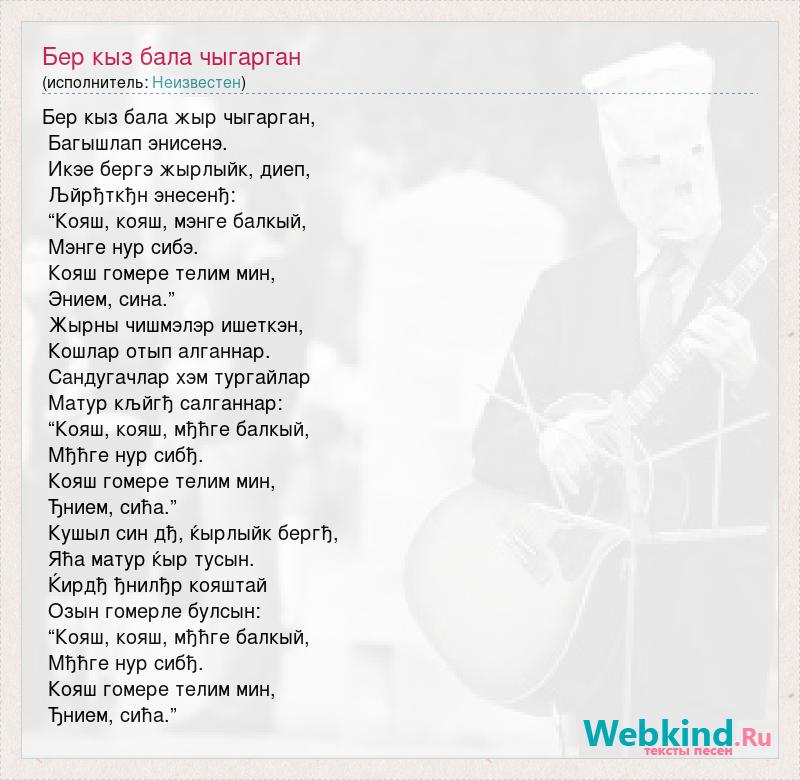 Бер кыз бала жыр чыгарган, Багышлап энисенэ. Икэe бергэ жырлыйк, диеп, Љйрђткђн энесенђ: “Кояш, кояш, мэнге балкый, Мэнге нур сибэ. Кояш гомере телим мин, Энием, сина.” Жырны чишмэлэр ишеткэн, Кошлар отып алганнар. Сандугачлар хэм тургайлар Матур кљйгђ салганнар: “Кояш, кояш, мђћге балкый, Мђћге нур сибђ. Кояш гомере телим мин, Ђнием, сића.” Кушыл син дђ, ќырлыйк бергђ, Яћа матур ќыр тусын. Ќирдђ ђнилђр кояштай Озын гомерле булсын: “Кояш, кояш, мђћге балкый, Мђћге нур сибђ. Кояш гомере телим мин, Ђнием, сића.”