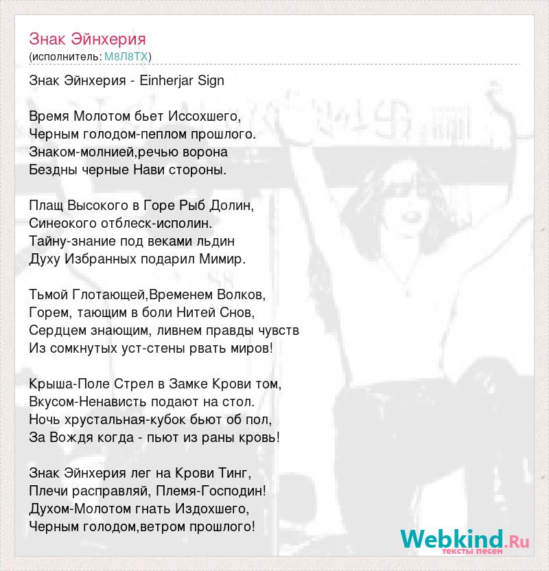 Знак Эйнхерия - Einherjar Sign Время Молотом бьет Иссохшего, Черным голодом-пеплом прошлого. Знаком-молнией,речью ворона Бездны черные Нави стороны. Плащ Высокого в Горе Рыб Долин, Синеокого отблеск-исполин. Тайну-знание под веками льдин Духу Избранных подарил Мимир. Тьмой Глотающей,Временем Волков, Горем, тающим в боли Нитей Снов, Сердцем знающим, ливнем правды чувств Из сомкнутых уст-стены рвать миров! Крыша-Поле Стрел в Замке Крови том, Вкусом-Ненависть подают на стол. Ночь хрустальная-кубок бьют об пол, За Вождя когда - пьют из раны кровь! Знак Эйнхерия лег на Крови Тинг, Плечи расправляй, Племя-Господин! Духом-Молотом гнать Издохшего, Черным голодом,ветром прошлого!