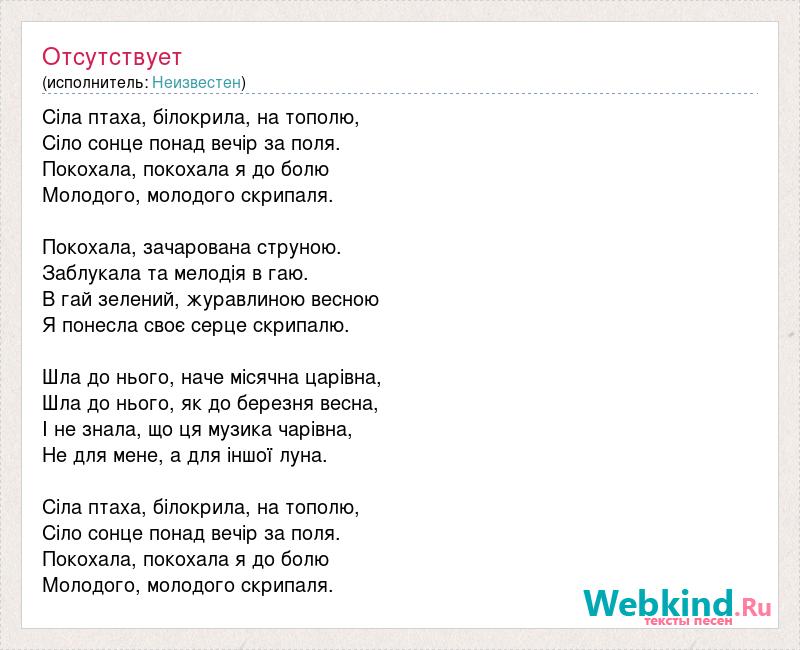 Сіла птаха, білокрила, на тополю, Сіло сонце понад вечір за поля. Покохала, покохала я до болю Молодого, молодого скрипаля. Покохала, зачарована струною. Заблукала та мелодія в гаю. В гай зелений, журавлиною весною Я понесла своє серце скрипалю. Шла до нього, наче місячна царівна, Шла до нього, як до березня весна, І не знала, що ця музика чарівна, Не для мене, а для іншої луна. Сіла птаха, білокрила, на тополю, Сіло сонце понад вечір за поля. Покохала, покохала я до болю Молодого, молодого скрипаля.