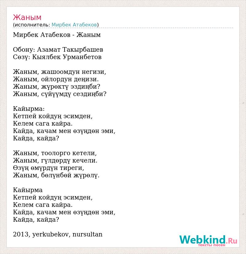 Мирбек Атабеков - Жаным Обону: Азамат Такырбашев Сөзү: Кыялбек Урманбетов Жаным, жашоомдун негизи, Жаным, ойлордун деңизи. Жаным, жүрөктү эздиңби? Жаным, сүйүүмдү сездиңби? Кайырма: Кетпей койдуң эсимден, Келем сага кайра. Кайда, качам мен өзүңдөн эми, Кайда, кайда? Жаным, тоолорго кетели, Жаным, гүлдөрдү кечели. Өзүң өмүрдүн тиреги, Жаным, бөлүнбөй жүрөлү. Кайырма Кетпей койдуң эсимден, Келем сага кайра. Кайда, качам мен өзүңдөн эми, Кайда, кайда? 2013, yerkubekov, nursultan