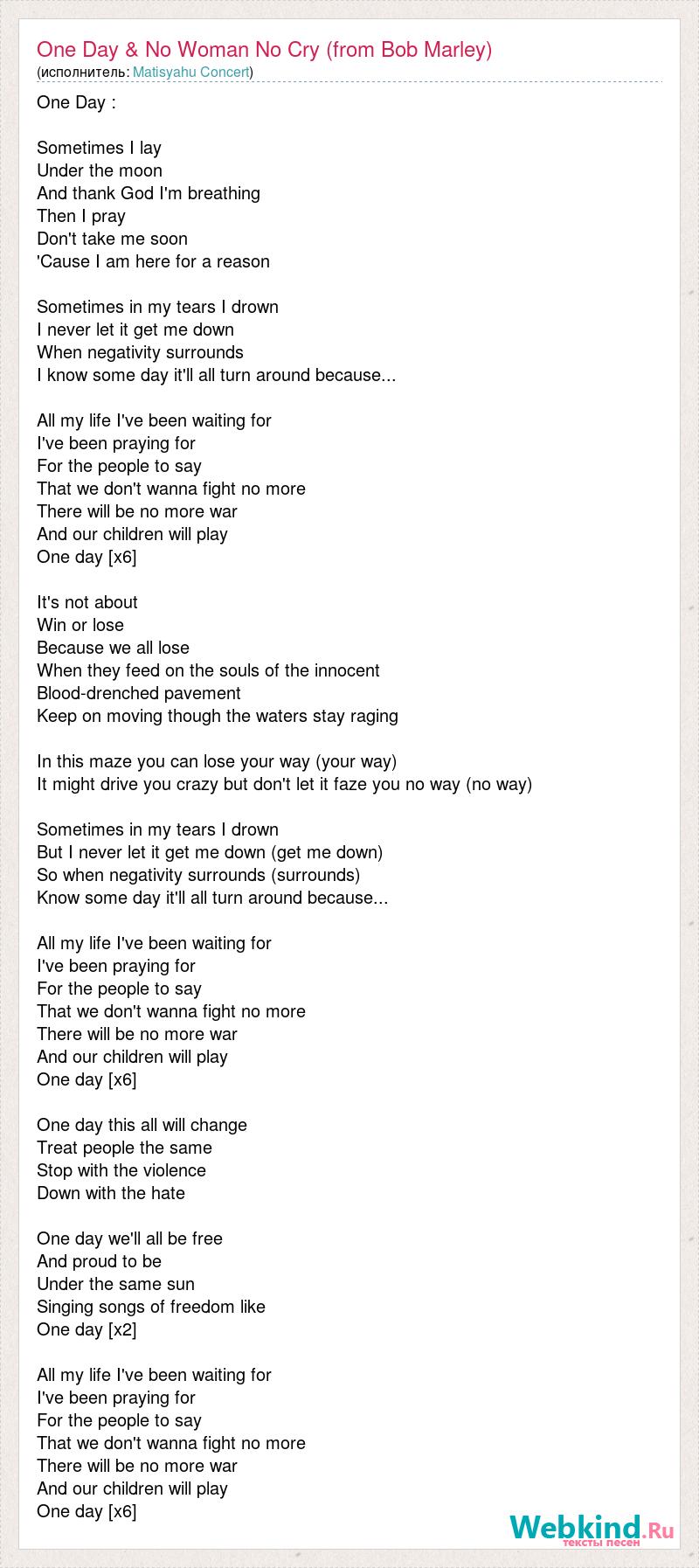 One Day : Sometimes I lay Under the moon And thank God I'm breathing Then I pray Don't take me soon 'Cause I am here for a reason Sometimes in my tears I drown I never let it get me down When negativity surrounds I know some day it'll all turn around because... All my life I've been waiting for I've been praying for For the people to say That we don't wanna fight no more There will be no more war And our children will play One day [x6] It's not about Win or lose Because we all lose When they feed on the souls of the innocent Blood-drenched pavement Keep on moving though the waters stay raging In this maze you can lose your way (your way) It might drive you crazy but don't let it faze you no way (no way) Sometimes in my tears I drown But I never let it get me down (get me down) So when negativity surrounds (surrounds) Know some day it'll all turn around because... All my life I've been waiting for I've been praying for For the people to say That we don't wanna fight no more There will be no more war And our children will play One day [x6] One day this all will change Treat people the same Stop with the violence Down with the hate One day we'll all be free And proud to be Under the same sun Singing songs of freedom like One day [x2] All my life I've been waiting for I've been praying for For the people to say That we don't wanna fight no more There will be no more war And our children will play One day [x6]