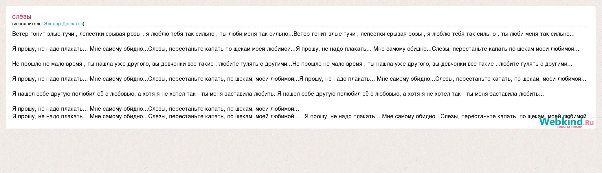 Ветер гонит злые тучи , лепестки срывая розы , я люблю тебя так сильно , ты люби меня так сильно...Ветер гонит злые тучи , лепестки срывая розы , я люблю тебя так сильно , ты люби меня так сильно... Я прошу, не надо плакать... Мне самому обидно...Слезы, перестаньте капать по щекам моей любимой...Я прошу, не надо плакать... Мне самому обидно...Слезы, перестаньте капать по щекам моей любимой... Не прошло не мало время , ты нашла уже другого, вы девчонки все такие , любите гулять с другими...Не прошло не мало время , ты нашла уже другого, вы девчонки все такие , любите гулять с другими... Я прошу, не надо плакать... Мне самому обидно...Слезы, перестаньте капать, по щекам, моей любимой...Я прошу, не надо плакать... Мне самому обидно...Слезы, перестаньте капать, по щекам, моей любимой... Я нашел себе другую полюбил её с любовью, а хотя я не хотел так - ты меня заставила любить. Я нашел себе другую полюбил её с любовью, а хотя я не хотел так - ты меня заставила любить... Я прошу, не надо плакать... Мне самому обидно...Слезы, перестаньте капать, по щекам, моей любимой... Я прошу, не надо плакать... Мне самому обидно...Слезы, перестаньте капать, по щекам, моей любимой......Я прошу, не надо плакать... Мне самому обидно...Слезы, перестаньте капать, по щекам, моей любимой.........