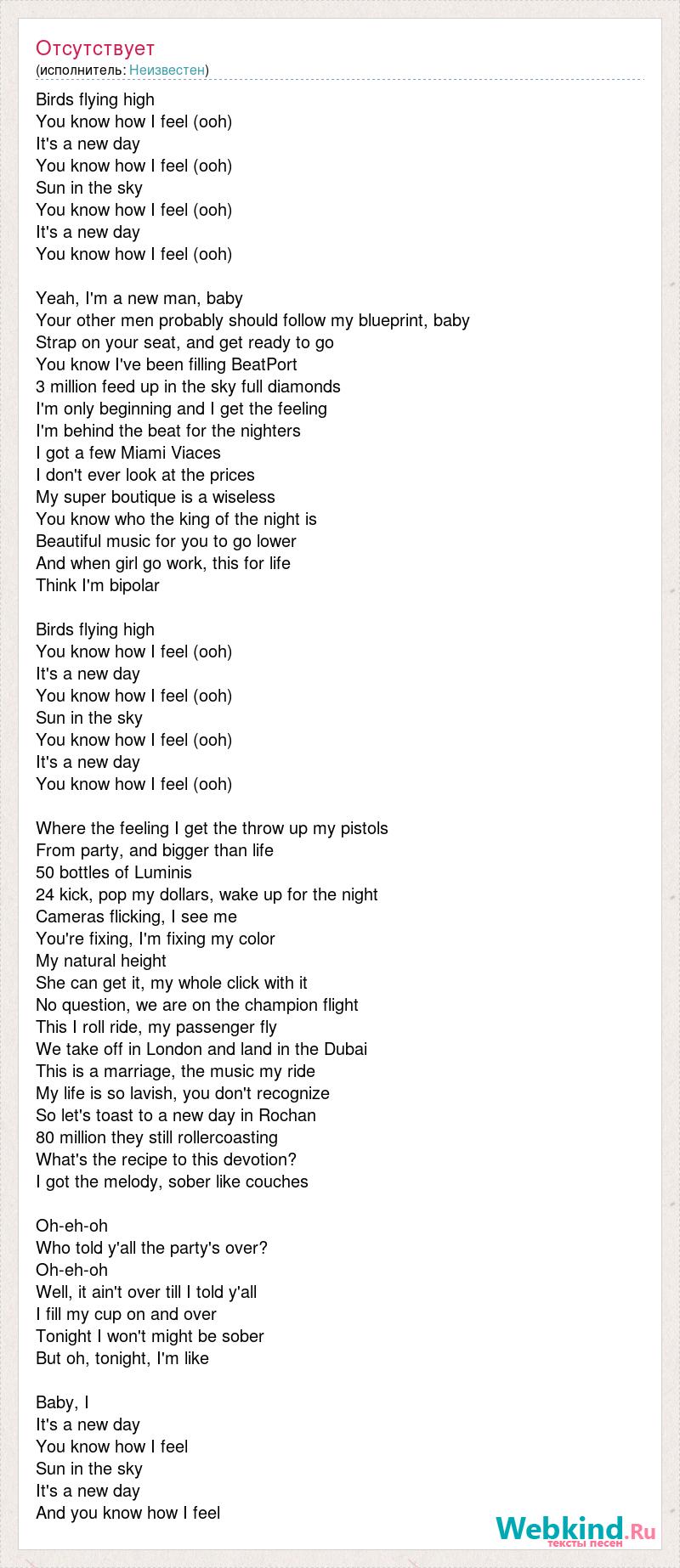 Birds flying high You know how I feel (ooh) It's a new day You know how I feel (ooh) Sun in the sky You know how I feel (ooh) It's a new day You know how I feel (ooh) Yeah, I'm a new man, baby Your other men probably should follow my blueprint, baby Strap on your seat, and get ready to go You know I've been filling BeatPort 3 million feed up in the sky full diamonds I'm only beginning and I get the feeling I'm behind the beat for the nighters I got a few Miami Viaces I don't ever look at the prices My super boutique is a wiseless You know who the king of the night is Beautiful music for you to go lower And when girl go work, this for life Think I'm bipolar Birds flying high You know how I feel (ooh) It's a new day You know how I feel (ooh) Sun in the sky You know how I feel (ooh) It's a new day You know how I feel (ooh) Where the feeling I get the throw up my pistols From party, and bigger than life 50 bottles of Luminis 24 kick, pop my dollars, wake up for the night Cameras flicking, I see me You're fixing, I'm fixing my color My natural height She can get it, my whole click with it No question, we are on the champion flight This I roll ride, my passenger fly We take off in London and land in the Dubai This is a marriage, the music my ride My life is so lavish, you don't recognize So let's toast to a new day in Rochan 80 million they still rollercoasting What's the recipe to this devotion? I got the melody, sober like couches Oh-eh-oh Who told y'all the party's over? Oh-eh-oh Well, it ain't over till I told y'all I fill my cup on and over Tonight I won't might be sober But oh, tonight, I'm like Baby, I It's a new day You know how I feel Sun in the sky It's a new day And you know how I feel
