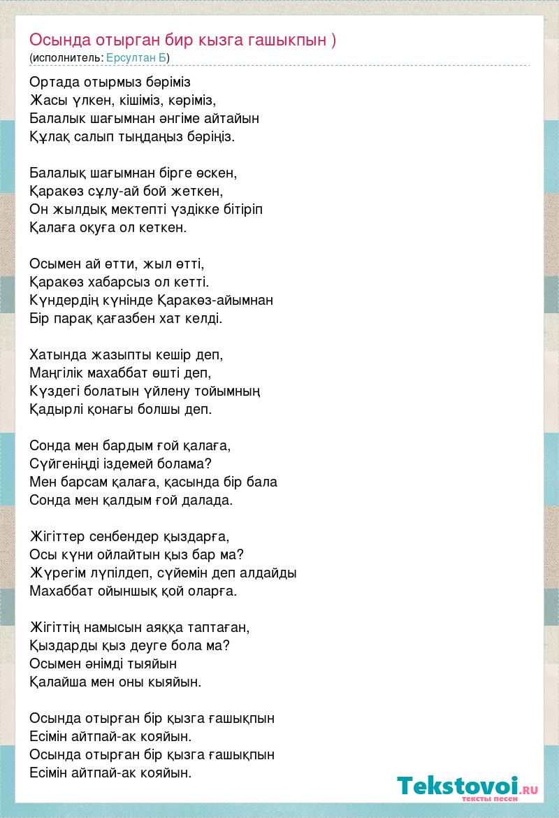 Ортада отырмыз бәрiмiз Жасы үлкен, кiшiмiз, кәрiмiз, Балалык шағымнан әнгiме айтайын Құлақ салып тыңдаңыз бәрiңiз. Балалық шағымнан бiрге өскен, Қаракөз сұлу-ай бой жеткен, Он жылдық мектепті үздiкке бiтiрiп Қалаға оқуға ол кеткен. Осымен ай өтти, жыл өттi, Қаракөз хабарсыз ол кеттi. Күндердiң күнiнде Қаракөз-айымнан Бiр парақ қағазбен хат келді. Хатында жазыпты кешiр деп, Маңгiлiк махаббат өшті деп, Күздегi болатын үйлену тойымның Қадырлі қонағы болшы деп. Сонда мен бардым ғой қалаға, Сүйгенiңдi iздемей болама? Мен барсам қалаға, қасында бiр бала Сонда мен қалдым ғой далада. Жiгiттер сенбендер қыздарға, Осы күни ойлайтын қыз бар ма? Жүрегім лүпілдеп, сүйемiн деп алдайды Махаббат ойыншық қой оларға. Жігіттің намысын аяққа таптаған, Қыздарды қыз деуге бола ма? Осымен әнімді тыяйын Қалайша мен оны кыяйын. Осында отырған бiр қызга ғашықпын Есiмін айтпай-ак кояйын. Осында отырған бiр қызга ғашықпын Есiмін айтпай-ак кояйын.