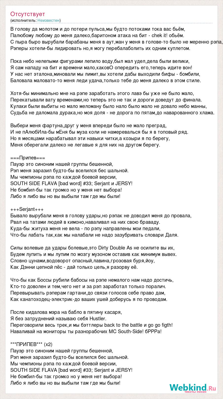 В голову да молотом и до потери пульса,мы будто потоками тока вас бьём, Палюбому любому до меня далеко,баритоном атака на бит - chek it! обьём. С пыра быро вырубали барабаны меня в аут,ман у меня в голове-то было не меренно рэпа, Рэперы хотели-бы лидировать но,я могу перебалаболить их одним куплетом. Пока небо нелепыми фигурами лепило воду,был мал удел,дела были велики, Я сам нападу на бит и времени мало,каковО опередить его,теперь идите вон! У нас нет эталона,миновали мы лимит,вы хотели дабы выходили бифы - бомбили, Баловала маловато-то меня леди удача,только тебе до меня далеко в этом стиле. Хотя-бы минимально мне на рэпе заработать этого лавэ бы уже не было мало, Перекатывали вату временами,но теперь это не так и дороги доведут до финала. Кулаки были выбиты но мало меломану было нало было мало не довало небо манны, Судьба не даломала дурака,но моя доля - не дорога по пятам,до наварованного хлама. Выбери меня фартуна,друг у меня впереди было не мало преград, И не пАлюбИла-бы мЕня бы муза коли не намеревалься бы я в топовый ряд. Но я месяцами нарабатывал эти навыки читки,а козыри я по берегу, Меня оберегали далеко не легавые я для них на другом берегу. ===Припев=== Пауэр это синоним нашей группы бешенной, Рэп меня заразил будто-бы вселился бес шальной. Мы чемпионы рэпа по каждой боевой версии, SOUTH SIDE FLAVA [bad word] #33; Serjant и JERSY! Не бомбил-бы так громко но у меня нет выбора! Либо я либо вы но вы выбыли там где мы были! +++Serjant+++ Бывало вырубали меня в голову удары,но рэпак не доводил меня до провала, Рвал на татами людей в кимоно,наваливал на них свою браваду. Куда-бы житуха меня не вела - по рэпу направлены мои педали, Что-бы лабать так,как мы налабали не надо зазубривать словари Даля. Силы волевые да удары болевые,это Dirty Double As не осилите вы их, Будем лупить и мы лупим по мозгу музоном оставив как минимум вывех. Словно цунами,водоворот опасный,лавина,грозовая буря,йоу, Как Дэнни цепной пёс - дай только цель,я разорву её. Что-бы как Боссы рубили бабосы на рэпе немалого нам надо достичь, Кто-то доволен и тем,чего нет и за рэп заработал только поралич. Перевырывать рэперам гартани,до связи голосов себе право дам, Как канатоходец-электрик-до ваших ушей доберусь я по проводам. После кидалова мэра на бабло в пятину касаря, Я без затруднений называю себя Hustler. Переговорили весь трек,и мы бэттлеры back to the battle и go go figth! Наваливай на мониторы ты разнорабочих MC South-Side! бРРРа! ***ПРИПЕВ*** (х2) Пауэр это синоним нашей группы бешенной, Рэп меня заразил будто-бы вселился бес шальной. Мы чемпионы рэпа по каждой боевой версии, SOUTH SIDE FLAVA [bad word] #33; Serjant и JERSY! Не бомбил-бы так громко но у меня нет выбора! Либо я либо вы но вы выбыли там где мы были!