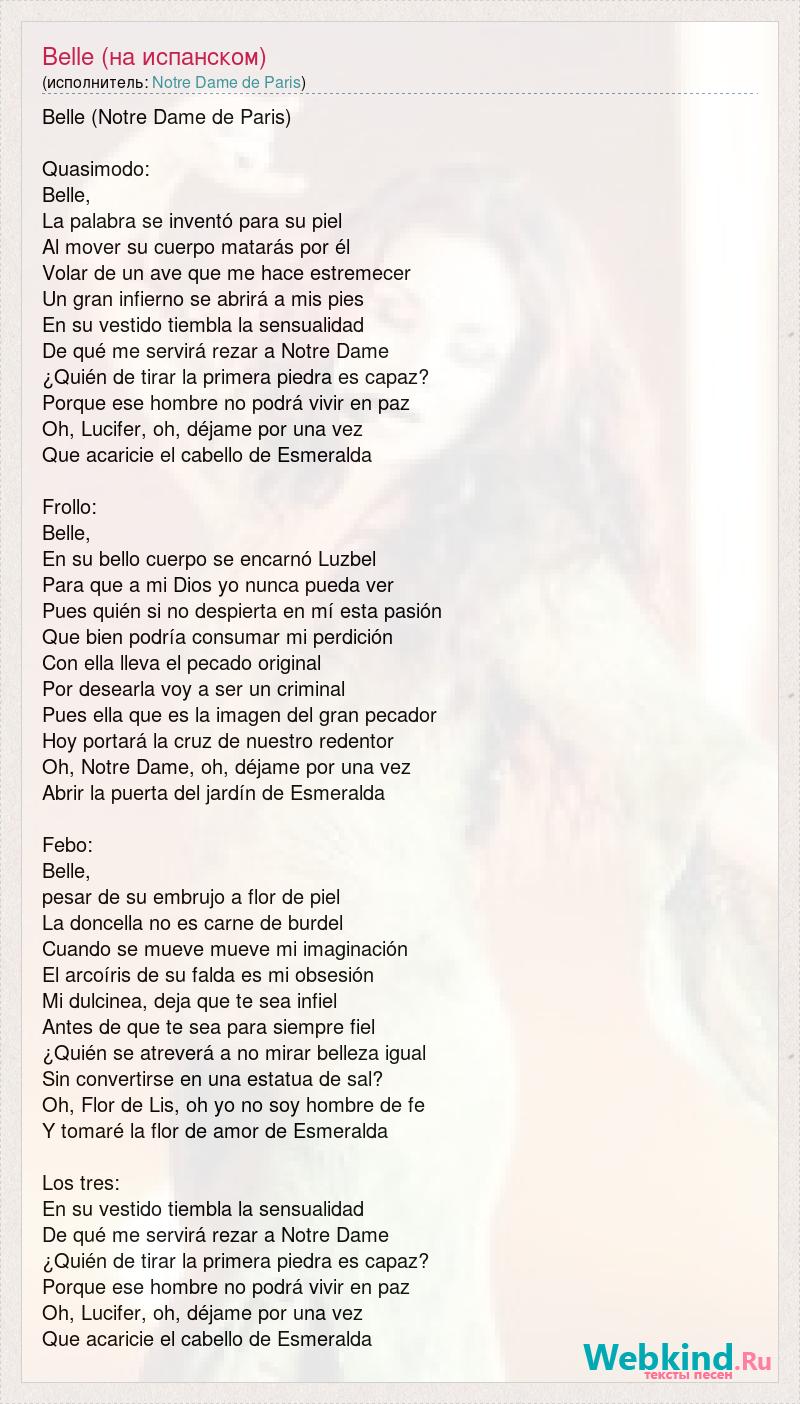 Belle (Notre Dame de Paris) Quasimodo: Belle, La palabra se inventó para su piel Al mover su cuerpo matarás por él Volar de un ave que me hace estremecer Un gran infierno se abrirá a mis pies En su vestido tiembla la sensualidad De qué me servirá rezar a Notre Dame ¿Quién de tirar la primera piedra es capaz? Porque ese hombre no podrá vivir en paz Oh, Lucifer, oh, déjame por una vez Que acaricie el cabello de Esmeralda Frollo: Belle, En su bello cuerpo se encarnó Luzbel Para que a mi Dios yo nunca pueda ver Pues quién si no despierta en mí esta pasión Que bien podría consumar mi perdición Con ella lleva el pecado original Por desearla voy a ser un criminal Pues ella que es la imagen del gran pecador Hoy portará la cruz de nuestro redentor Oh, Notre Dame, oh, déjame por una vez Abrir la puerta del jardín de Esmeralda Febo: Belle, pesar de su embrujo a flor de piel La doncella no es carne de burdel Cuando se mueve mueve mi imaginación El arcoíris de su falda es mi obsesión Mi dulcinea, deja que te sea infiel Antes de que te sea para siempre fiel ¿Quién se atreverá a no mirar belleza igual Sin convertirse en una estatua de sal? Oh, Flor de Lis, oh yo no soy hombre de fe Y tomaré la flor de amor de Esmeralda Los tres: En su vestido tiembla la sensualidad De qué me servirá rezar a Notre Dame ¿Quién de tirar la primera piedra es capaz? Porque ese hombre no podrá vivir en paz Oh, Lucifer, oh, déjame por una vez Que acaricie el cabello de Esmeralda