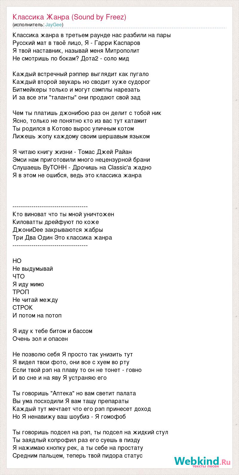 Классика жанра в третьем раунде нас разбили на пары Русский мат в твоё лицо, Я - Гарри Каспаров Я твой наставник, называй меня Митрополит Не смотришь по бокам? Дота2 - соло мид Каждый встречный рэппер выглядит как пугало Каждый второй звукарь но сводит хуже судорог Битмейкеры только и могут сэмплы нарезать И за все эти "таланты" они продают свой зад Чем ты платишь джонибою раз он делит с тобой ник Ясно, только не понятно кто из вас тут катамит Ты родился в Котово вырос уличным котом Лижешь жопу каждому своим шершавым языком Я читаю книгу жизни - Томас Джей Райан Эмси нам приготовили много нецензурной брани Слушаешь ВуТОНН - Дрочишь на Classic'a жадно Я в этом не ошибся, ведь это классика жанра ------------------------------------ Кто виноват что ты мной уничтожен Киловатты дрейфуют по коже ДжониDee закрываются жабры Три Два Один Это классика жанра ------------------------------------ НО Не выдумывай ЧТО Я иду мимо ТРОП Не читай между СТРОК И потом на потоп Я иду к тебе битом и бассом Очень зол и опасен Не позволю себя Я просто так унизить тут Я видел твои фото, они все с хуем во рту Если твой рэп на плаву то он не тонет - говно И во сне и на яву Я устраняю его Ты говоришь "Аптека" но вам светит палата Вы ума посходили Я вам тащу препараты Каждый тут мечтает что его рэп принесет доход Но Я ненавижу ваш шоубиз - Я гомофоб Ты говоришь подсел на рэп, ты подсел на жидкий стул Ты заядлый копрофил раз его суешь в пизду Я нажимаю кнопку рек, а ты себе на простату Средним пальцем, теперь твой пидора статус