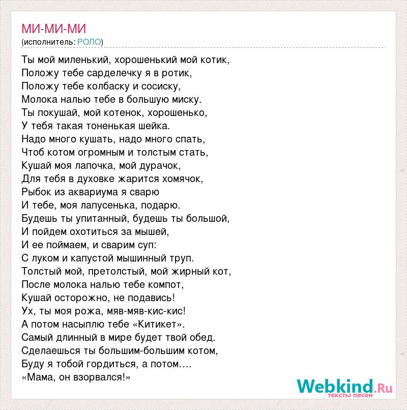 Ты мой миленький, хорошенький мой котик, Положу тебе сарделечку я в ротик, Положу тебе колбаску и сосиску, Молока налью тебе в большую миску. Ты покушай, мой котенок, хорошенько, У тебя такая тоненькая шейка. Надо много кушать, надо много спать, Чтоб котом огромным и толстым стать, Кушай моя лапочка, мой дурачок, Для тебя в духовке жарится хомячок, Рыбок из аквариума я сварю И тебе, моя лапусенька, подарю. Будешь ты упитанный, будешь ты большой, И пойдем охотиться за мышей, И ее поймаем, и сварим суп: С луком и капустой мышинный труп. Толстый мой, претолстый, мой жирный кот, После молока налью тебе компот, Кушай осторожно, не подавись! Ух, ты моя рожа, мяв-мяв-кис-кис! А потом насыплю тебе «Китикет». Самый длинный в мире будет твой обед. Сделаешься ты большим-большим котом, Буду я тобой гордиться, а потом…. «Мама, он взорвался!»