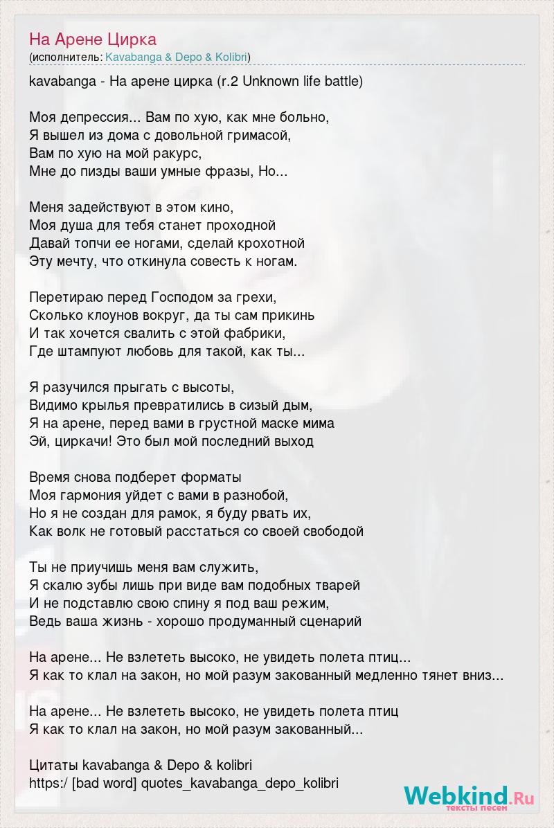 kavabanga - На арене цирка (r.2 Unknown life battle) Моя депрессия... Вам по хую, как мне больно, Я вышел из дома с довольной гримасой, Вам по хую на мой ракурс, Мне до пизды ваши умные фразы, Но... Меня задействуют в этом кино, Моя душа для тебя станет проходной Давай топчи ее ногами, сделай крохотной Эту мечту, что откинула совесть к ногам. Перетираю перед Господом за грехи, Сколько клоунов вокруг, да ты сам прикинь И так хочется свалить с этой фабрики, Где штампуют любовь для такой, как ты... Я разучился прыгать с высоты, Видимо крылья превратились в сизый дым, Я на арене, перед вами в грустной маске мима Эй, циркачи! Это был мой последний выход Время снова подберет форматы Моя гармония уйдет с вами в разнобой, Но я не создан для рамок, я буду рвать их, Как волк не готовый расстаться со своей свободой Ты не приучишь меня вам служить, Я скалю зубы лишь при виде вам подобных тварей И не подставлю свою спину я под ваш режим, Ведь ваша жизнь - хорошо продуманный сценарий На арене... Не взлететь высоко, не увидеть полета птиц... Я как то клал на закон, но мой разум закованный медленно тянет вниз... На арене... Не взлететь высоко, не увидеть полета птиц Я как то клал на закон, но мой разум закованный... Цитаты kavabanga & Depo & kolibri https:/ [bad word] quotes_kavabanga_depo_kolibri