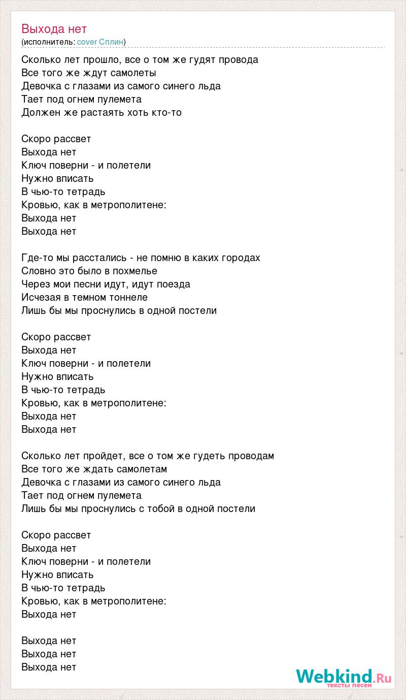 Сколько лет прошло, все о том же гудят провода Все того же ждут самолеты Девочка с глазами из самого синего льда Тает под огнем пулемета Должен же растаять хоть кто-то Скоро рассвет Выхода нет Ключ поверни - и полетели Нужно вписать В чью-то тетрадь Кровью, как в метрополитене: Выхода нет Выхода нет Где-то мы расстались - не помню в каких городах Словно это было в похмелье Через мои песни идут, идут поезда Исчезая в темном тоннеле Лишь бы мы проснулись в одной постели Скоро рассвет Выхода нет Ключ поверни - и полетели Нужно вписать В чью-то тетрадь Кровью, как в метрополитене: Выхода нет Выхода нет Сколько лет пройдет, все о том же гудеть проводам Все того же ждать самолетам Девочка с глазами из самого синего льда Тает под огнем пулемета Лишь бы мы проснулись с тобой в одной постели Скоро рассвет Выхода нет Ключ поверни - и полетели Нужно вписать В чью-то тетрадь Кровью, как в метрополитене: Выхода нет Выхода нет Выхода нет Выхода нет