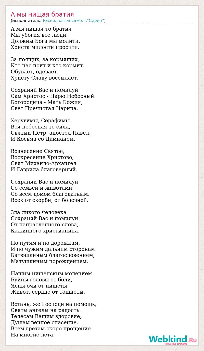А мы нищая-то братия Мы убогия все люди. Должны Бога мы молити, Христа милости просити. За поящих, за кормящих, Кто нас поит и кто кормит. Обувает, одевает. Христу Славу воссылает. Сохраняй Вас и помилуй Сам Христос - Царю Небесный. Богородица - Мать Божия, Свет Пречистая Царица. Херувимы, Серафимы Вся небесная то сила, Святый Петр, апостол Павел, И Косьма со Дамианом. Вознесение Святое, Воскресение Христово, Свят Михаило-Архангел И Гаврила благоверный. Сохраняй Вас и помилуй Со семьей и животами. Со всем домом благодатным. Всех от скорби, от болезней. Зла лихого человека Сохраняй Вас и помилуй От напрасленного слова, Кажйиного христианина. По путям и по дорожкам, И по чужим дальним сторонам Батюшкиным благословением, Матушкиным порождением. Нашим нищенским молением Буйны головы от боли, Ясны очи от нищеты. Живот, сердце от тошноты. Встань, же Господи на помощь, Святы ангелы на радость. Телесам Вашим здоровие, Душам вечное спасение. Всем грехам скоро прощение На многие лета.