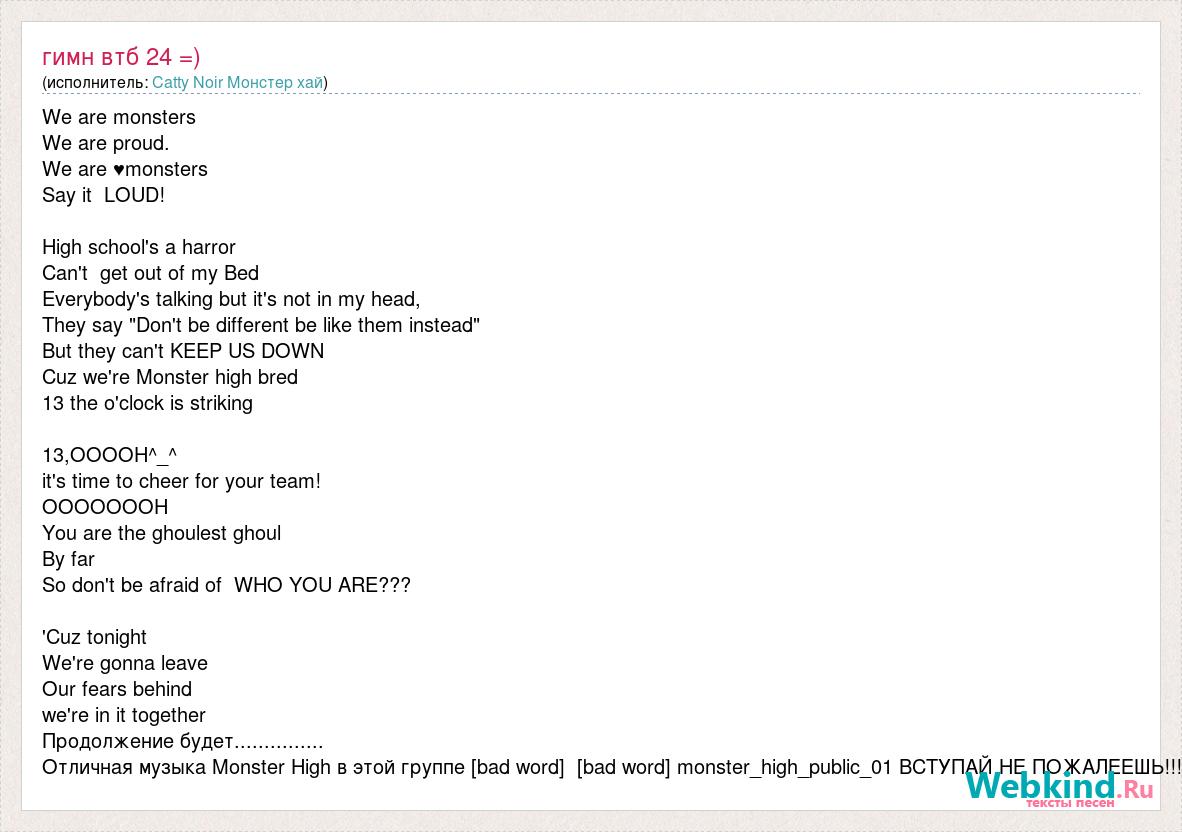We are monsters We are proud. We are ♥monsters Say it LOUD! High school's a harror Can't get out of my Bed Everybody's talking but it's not in my head, They say "Don't be different be like them instead" But they can't KEEP US DOWN Cuz we're Monster high bred 13 the o'clock is striking 13,OOOOH^_^ it's time to cheer for your team! OOOOOOOH You are the ghoulest ghoul By far So don't be afraid of WHO YOU ARE??? 'Cuz tonight We're gonna leave Our fears behind we're in it together Продолжение будет............... Отличная музыка Monster High в этой группе [bad word] [bad word] monster_high_public_01 ВСТУПАЙ НЕ ПОЖАЛЕЕШЬ!!!
