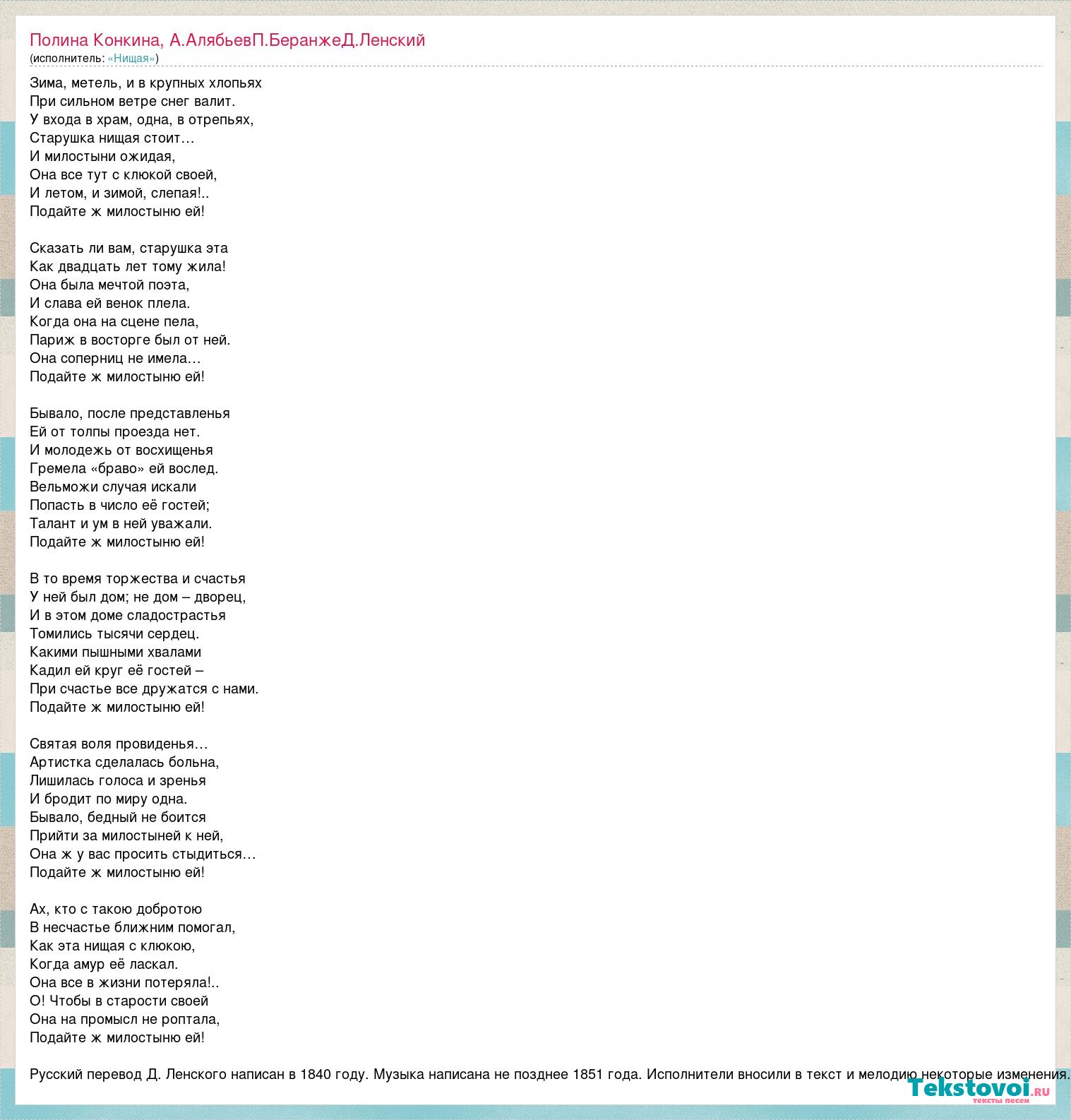 Зима, метель, и в крупных хлопьях При сильном ветре снег валит. У входа в храм, одна, в отрепьях, Старушка нищая стоит… И милостыни ожидая, Она все тут с клюкой своей, И летом, и зимой, слепая!.. Подайте ж милостыню ей! Сказать ли вам, старушка эта Как двадцать лет тому жила! Она была мечтой поэта, И слава ей венок плела. Когда она на сцене пела, Париж в восторге был от ней. Она соперниц не имела… Подайте ж милостыню ей! Бывало, после представленья Ей от толпы проезда нет. И молодежь от восхищенья Гремела «браво» ей вослед. Вельможи случая искали Попасть в число её гостей; Талант и ум в ней уважали. Подайте ж милостыню ей! В то время торжества и счастья У ней был дом; не дом – дворец, И в этом доме сладострастья Томились тысячи сердец. Какими пышными хвалами Кадил ей круг её гостей – При счастье все дружатся с нами. Подайте ж милостыню ей! Святая воля провиденья… Артистка сделалась больна, Лишилась голоса и зренья И бродит по миру одна. Бывало, бедный не боится Прийти за милостыней к ней, Она ж у вас просить стыдиться… Подайте ж милостыню ей! Ах, кто с такою добротою В несчастье ближним помогал, Как эта нищая с клюкою, Когда амур её ласкал. Она все в жизни потеряла!.. О! Чтобы в старости своей Она на промысл не роптала, Подайте ж милостыню ей! Русский перевод Д. Ленского написан в 1840 году. Музыка написана не позднее 1851 года. Исполнители вносили в текст и мелодию некоторые изменения.