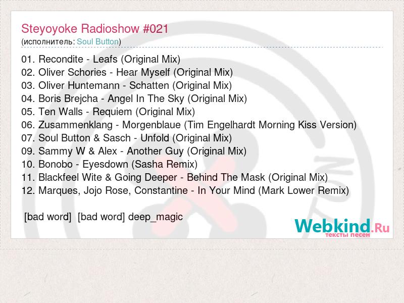01. Recondite - Leafs (Original Mix) 02. Oliver Schories - Hear Myself (Original Mix) 03. Oliver Huntemann - Schatten (Original Mix) 04. Boris Brejcha - Angel In The Sky (Original Mix) 05. Ten Walls - Requiem (Original Mix) 06. Zusammenklang - Morgenblaue (Tim Engelhardt Morning Kiss Version) 07. Soul Button & Sasch - Unfold (Original Mix) 09. Sammy W & Alex - Another Guy (Original Mix) 10. Bonobo - Eyesdown (Sasha Remix) 11. Blackfeel Wite & Going Deeper - Behind The Mask (Original Mix) 12. Marques, Jojo Rose, Constantine - In Your Mind (Mark Lower Remix) [bad word] [bad word] deep_magic