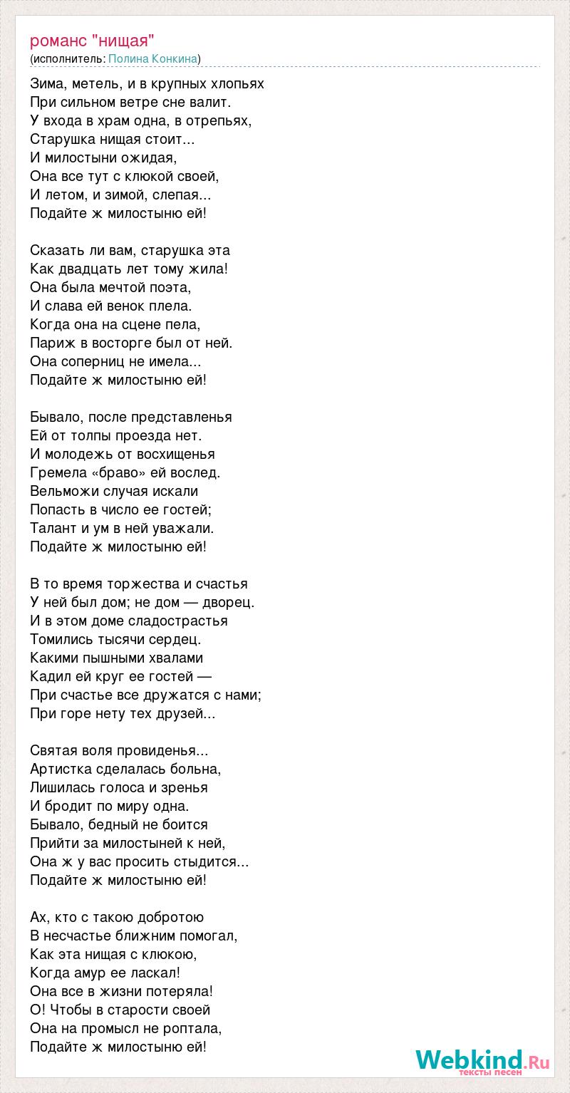 Зима, метель, и в крупных хлопьях При сильном ветре сне валит. У входа в храм одна, в отрепьях, Старушка нищая стоит... И милостыни ожидая, Она все тут с клюкой своей, И летом, и зимой, слепая... Подайте ж милостыню ей! Сказать ли вам, старушка эта Как двадцать лет тому жила! Она была мечтой поэта, И слава ей венок плела. Когда она на сцене пела, Париж в восторге был от ней. Она соперниц не имела... Подайте ж милостыню ей! Бывало, после представленья Ей от толпы проезда нет. И молодежь от восхищенья Гремела «браво» ей вослед. Вельможи случая искали Попасть в число ее гостей; Талант и ум в ней уважали. Подайте ж милостыню ей! В то время торжества и счастья У ней был дом; не дом — дворец. И в этом доме сладострастья Томились тысячи сердец. Какими пышными хвалами Кадил ей круг ее гостей — При счастье все дружатся с нами; При горе нету тех друзей... Святая воля провиденья... Артистка сделалась больна, Лишилась голоса и зренья И бродит по миру одна. Бывало, бедный не боится Прийти за милостыней к ней, Она ж у вас просить стыдится... Подайте ж милостыню ей! Ах, кто с такою добротою В несчастье ближним помогал, Как эта нищая с клюкою, Когда амур ее ласкал! Она все в жизни потеряла! О! Чтобы в старости своей Она на промысл не роптала, Подайте ж милостыню ей!