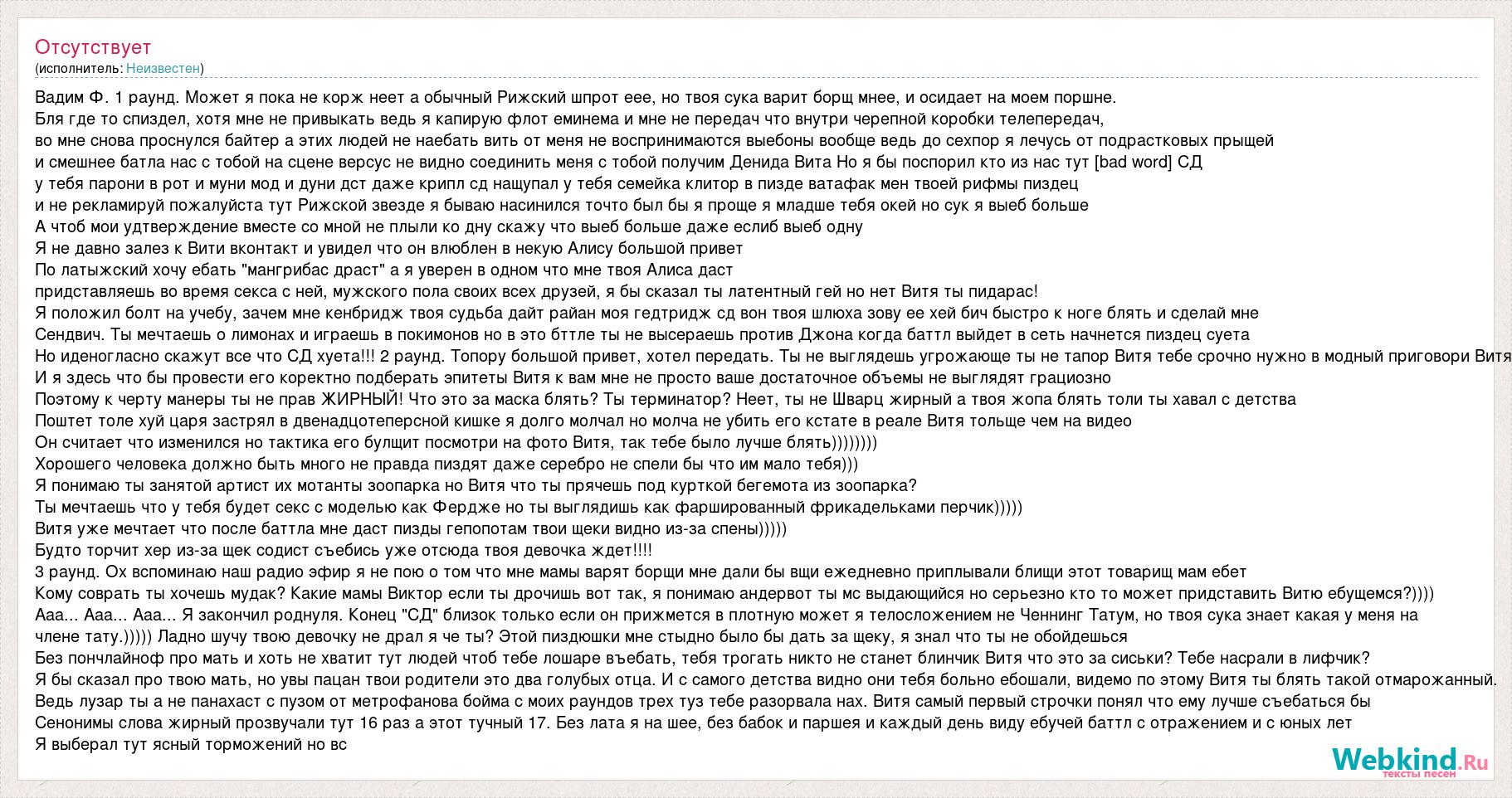 Вадим Ф. 1 раунд. Может я пока не корж неет а обычный Рижский шпрот еее, но твоя сука варит борщ мнее, и осидает на моем поршне. Бля где то спиздел, хотя мне не привыкать ведь я капирую флот еминема и мне не передач что внутри черепной коробки телепередач, во мне снова проснулся байтер а этих людей не наебать вить от меня не воспринимаются выебоны вообще ведь до сехпор я лечусь от подрастковых прыщей и смешнее батла нас с тобой на сцене версус не видно соединить меня с тобой получим Денида Вита Но я бы поспорил кто из нас тут [bad word] СД у тебя парони в рот и муни мод и дуни дст даже крипл сд нащупал у тебя семейка клитор в пизде ватафак мен твоей рифмы пиздец и не рекламируй пожалуйста тут Рижской звезде я бываю насинился точто был бы я проще я младше тебя окей но сук я выеб больше А чтоб мои удтверждение вместе со мной не плыли ко дну скажу что выеб больше даже еслиб выеб одну Я не давно залез к Вити вконтакт и увидел что он влюблен в некую Алису большой привет По латыжский хочу ебать "мангрибас драст" а я уверен в одном что мне твоя Алиса даст придставляешь во время секса с ней, мужского пола своих всех друзей, я бы сказал ты латентный гей но нет Витя ты пидарас! Я положил болт на учебу, зачем мне кенбридж твоя судьба дайт райан моя гедтридж сд вон твоя шлюха зову ее хей бич быстро к ноге блять и сделай мне Сендвич. Ты мечтаешь о лимонах и играешь в покимонов но в это бттле ты не высераешь против Джона когда баттл выйдет в сеть начнется пиздец суета Но иденогласно скажут все что СД хуета!!! 2 раунд. Топору большой привет, хотел передать. Ты не выглядешь угрожающе ты не тапор Витя тебе срочно нужно в модный приговори Витя И я здесь что бы провести его коректно подберать эпитеты Витя к вам мне не просто ваше достаточное объемы не выглядят грациозно Поэтому к черту манеры ты не прав ЖИРНЫЙ! Что это за маска блять? Ты терминатор? Неет, ты не Шварц жирный а твоя жопа блять толи ты хавал с детства Поштет толе хуй царя застрял в двенадцотеперсной кишке я долго молчал но молча не убить его кстате в реале Витя тольще чем на видео Он считает что изменился но тактика его булщит посмотри на фото Витя, так тебе было лучше блять)))))))) Хорошего человека должно быть много не правда пиздят даже серебро не спели бы что им мало тебя))) Я понимаю ты занятой артист их мотанты зоопарка но Витя что ты прячешь под курткой бегемота из зоопарка? Ты мечтаешь что у тебя будет секс с моделью как Фердже но ты выглядишь как фаршированный фрикадельками перчик))))) Витя уже мечтает что после баттла мне даст пизды гепопотам твои щеки видно из-за спены))))) Будто торчит хер из-за щек содист съебись уже отсюда твоя девочка ждет!!!! 3 раунд. Ох вспоминаю наш радио эфир я не пою о том что мне мамы варят борщи мне дали бы вщи ежедневно приплывали блищи этот товарищ мам ебет Кому соврать ты хочешь мудак? Какие мамы Виктор если ты дрочишь вот так, я понимаю андервот ты мс выдающийся но серьезно кто то может придставить Витю ебущемся?)))) Ааа... Ааа... Ааа... Я закончил роднуля. Конец "СД" близок только если он прижмется в плотную может я телосложением не Ченнинг Татум, но твоя сука знает какая у меня на члене тату.))))) Ладно шучу твою девочку не драл я че ты? Этой пиздюшки мне стыдно было бы дать за щеку, я знал что ты не обойдешься Без пончлайноф про мать и хоть не хватит тут людей чтоб тебе лошаре въебать, тебя трогать н